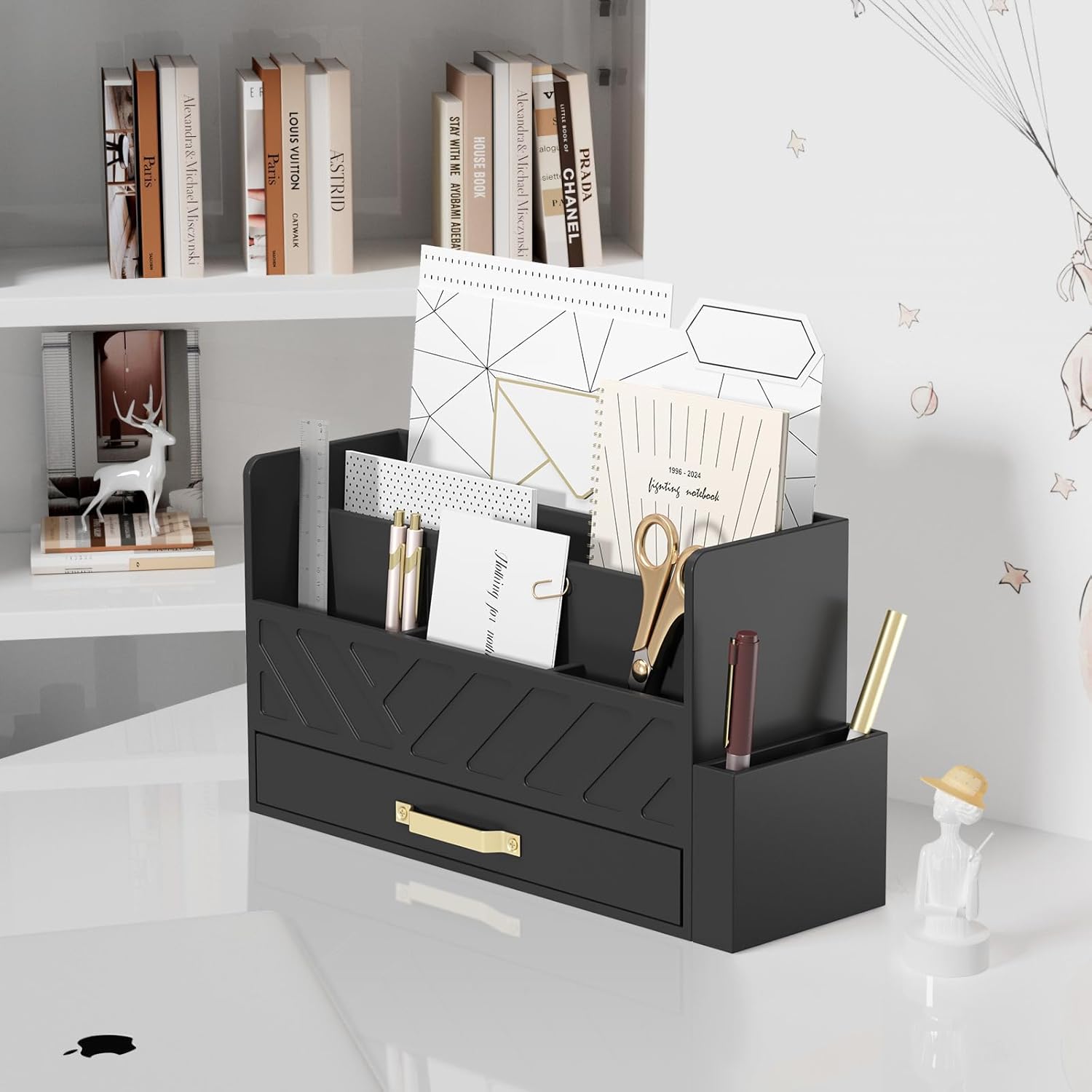 - Stylish office desk organizer: Upgrade your workspace with this stylish desk organizer, enhanced with gold mental drawers perfect for desk organization and file storage, With its sleek design for all your desk accessories, this desktop organizer is not only functional but also adds a touch of sophistication to any home office or work desk.
