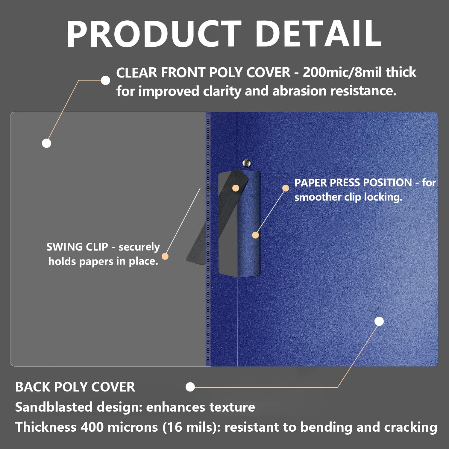 - Premium Clear & dent resistant folders: This file folder made with high-quality plastic. Crafted with 200-micron (8mil) optical-grade polypropylene front cover delivering crystal clarity – instantly reveal document titles for quick access. The 400-micron (16mil) reinforced back features a non-slip suede-textured finish that resists scratches, tears, and bending while providing protection.