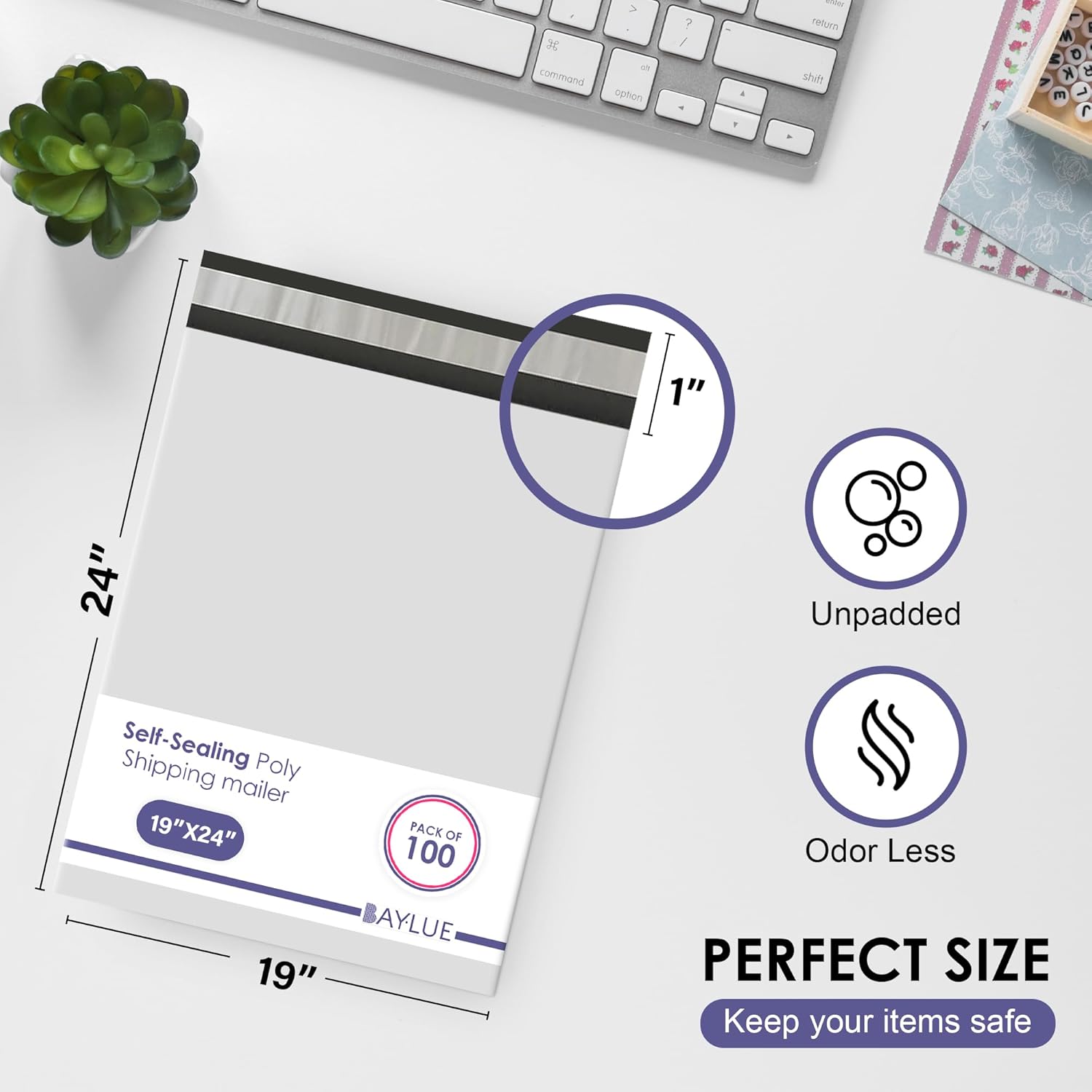White Large Poly Mailers 19x24 Inch | Strong Adhesive Self-Seal Mailer Bags | Tear, Tamper, Water Resistant Shipping Envelopes | Thick Strong polymailer Bags XL Clothing Shipping Bags | 100 Pcs Bulk