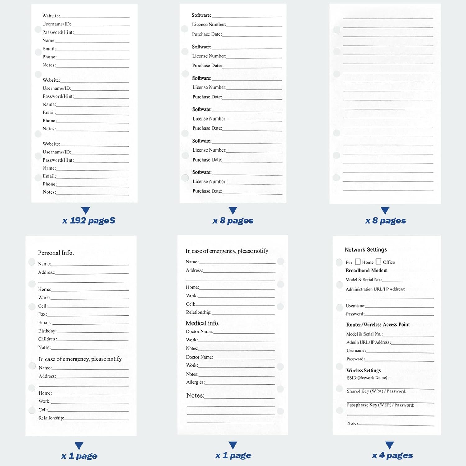 - Value Pack: Unlike other competitors' fewer pages, our A6 password book refills provide as many as 216 pages to bring you more value so you can use it for longer. Our set has 192 pages/ 96 sheets for password entries, 8 pages/4 sheets of lined pages, 4 pages for email settings, 4 for network settings, 2 for wireless settings, 1 for emergency contact, 1 for personal info, and 1 for PVC protect sheet.