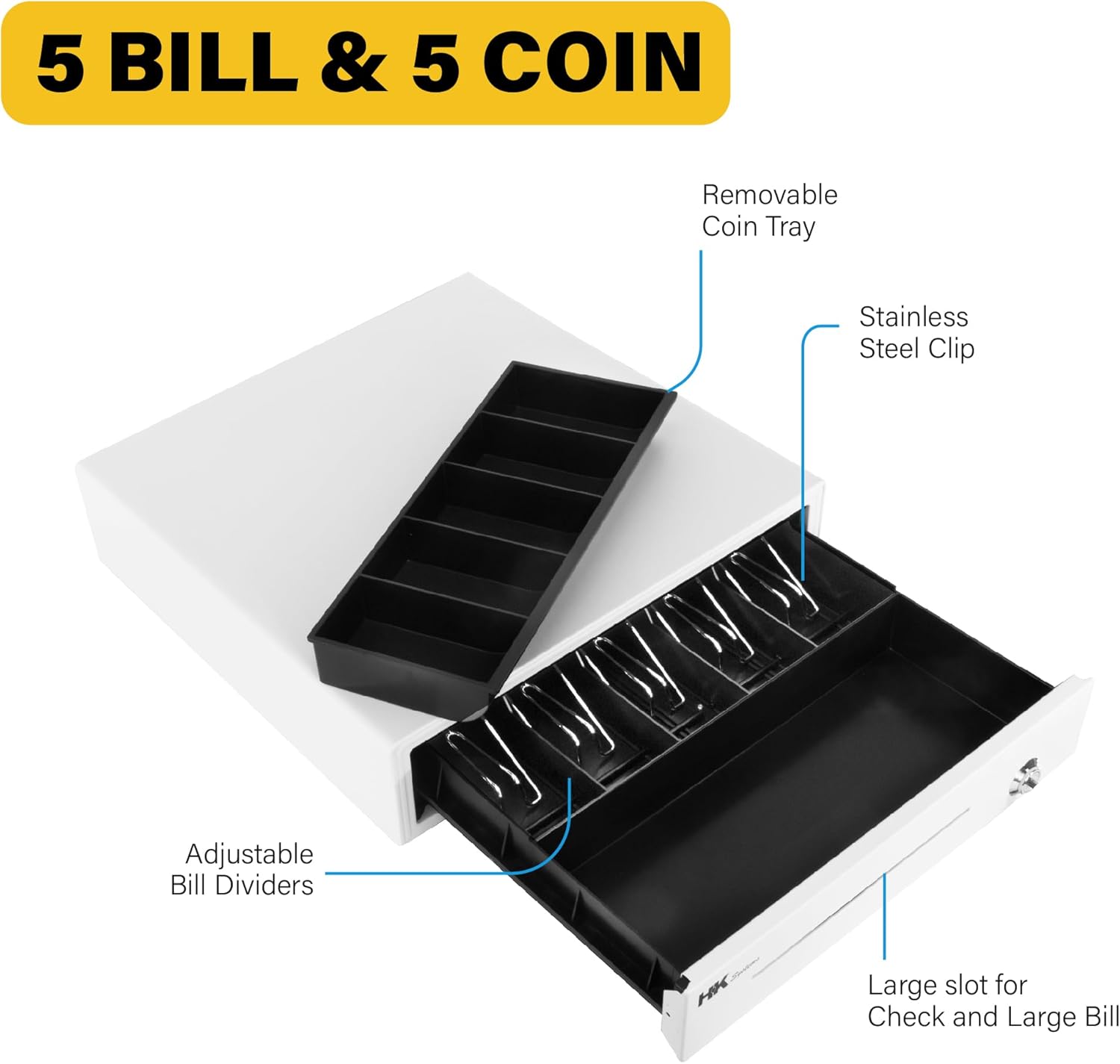 HK SYSTEMS 16inch Heavy Duty POS Cash Drawer with 5Bill/5Coin, Removable Coin Compartment, 24V, RJ11, Single Large Media Slot, White
