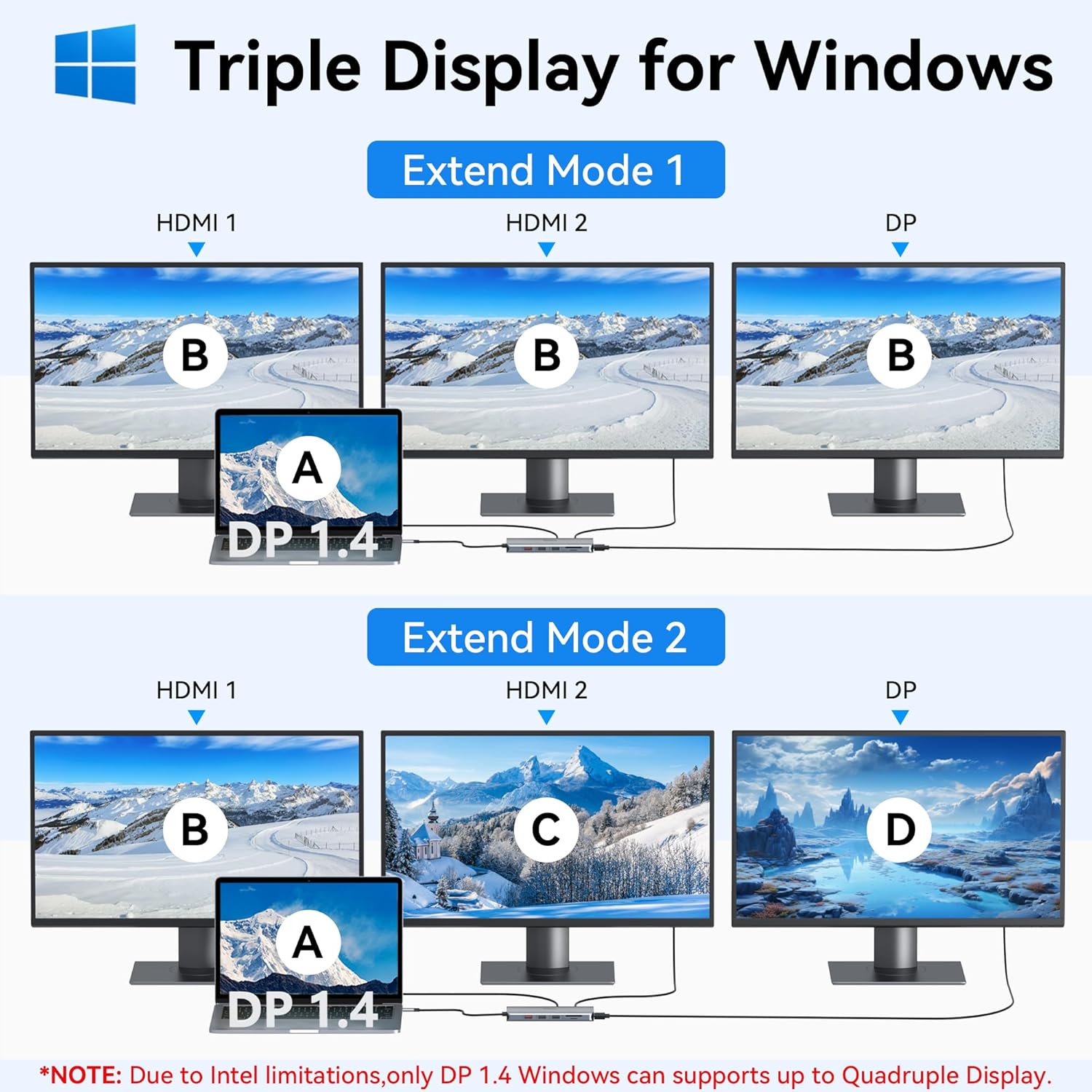 - ă4K Dual HDMI+DP Docking Station 3 Monitors ăThis laptop docking station dual monitor ONLY Windows system support MST and SST(Mirror & Extend Mode). Single use HDMI1 or DP can up to 4K under DP1.4 source. The resolution of monitors will be always consistent with laptop if mirror display under Windows system. (Note: MacOS system DOES NOT support triple display. The screens of external monitors are the same, no matter they are displayed in mirror mode or extended mode.)