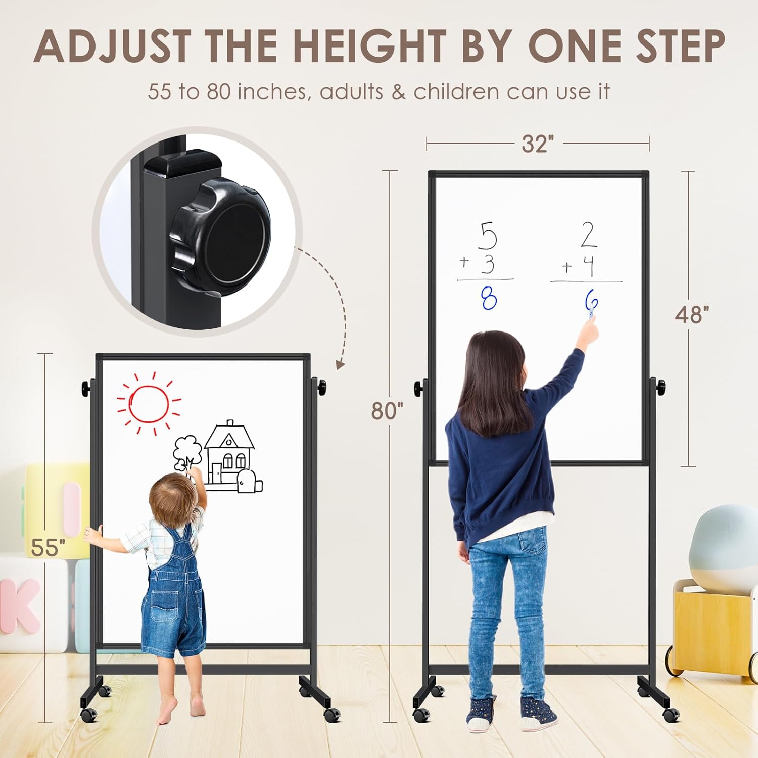 - Effortless Height Adjustment: Elevate your space with Reliaboard's large rolling whiteboard and noticeboard. Easily adjust the height from 55" to 80" with the sliding device, suitable for adults and kids. No tedious reassembly – achieve your preferred height without disassembling. Setup in 15 minutes with included hardware and tools, guided by our simple instructions. Enjoy swift and convenient height customization for a comfortable and efficient experience