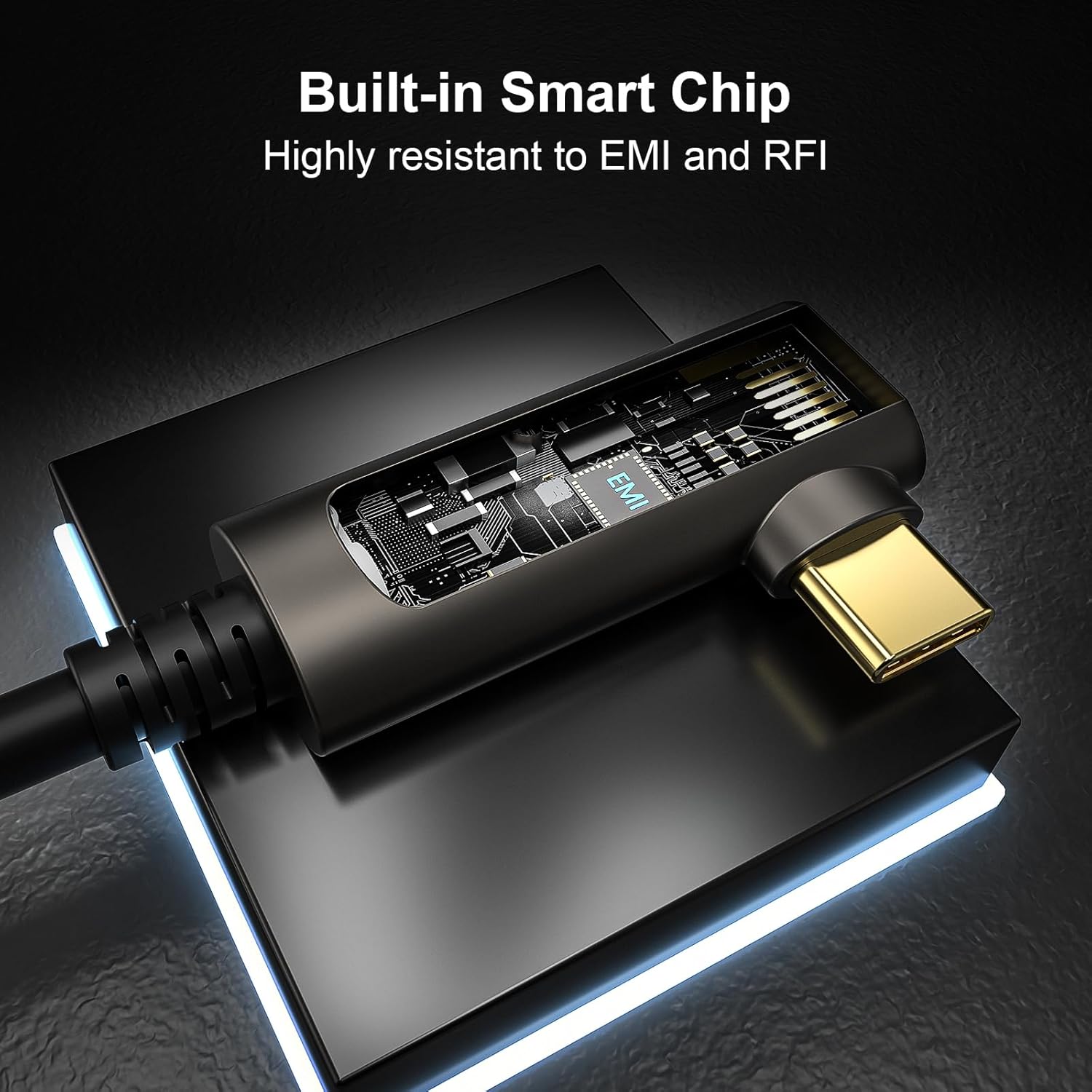 - 【Right Angle Designed】This USB-C to USB-C extension cable is a four-core optical fiber with multiple internal shielding, and the fiber core is covered with Kevlar fiber. Experience effortless connectivity with this USB-C to right-angle USB-C cable(a 90° angle), promoting ease of use and safe and secure data transfer. The advanced alloy and 24K gold-plated connectors can resist corrosion and are more durable.
