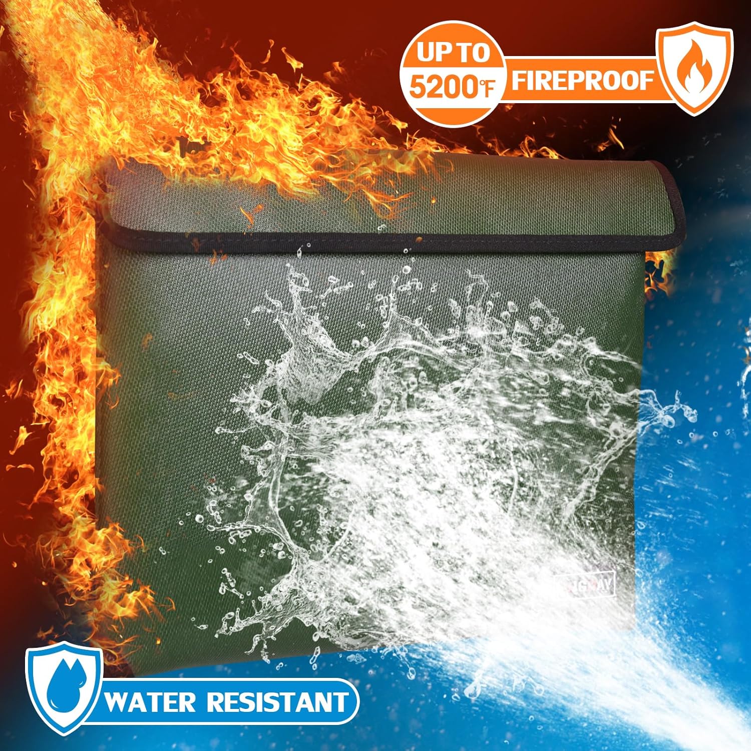 Fireproof Document Bag - with 5200°F Heat Insulated, Waterproof Fireproof Bag with Zipper, Fireproof Money Bag for Cash/Documents/Valuables, Fire bag (Green, 11"x7.7")