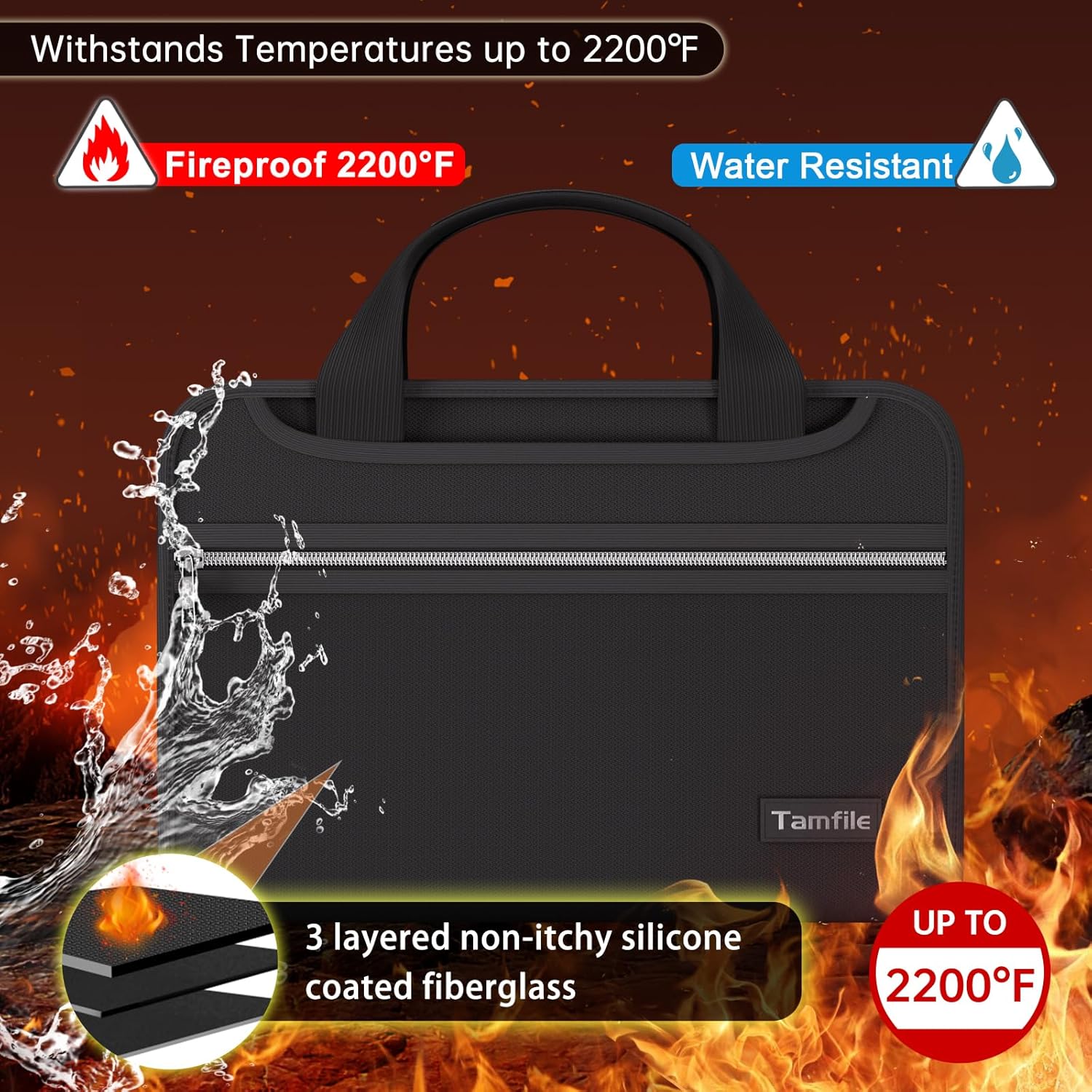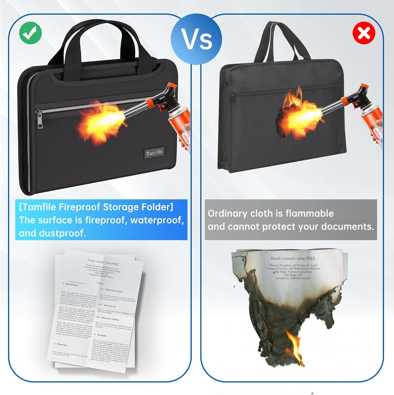 - Tamfile Fireproof Storage Folder: Fireproof, Waterproof, Dustproof. The folder surface is made of upgraded silicone glass fiber fabric with fireproof and waterproof properties, capable of withstanding temperatures up to 2200°F and passing SGS testing (UL94 certification).Fireproof multifunctional folders are suitable for storing and organizing your valuable materials certificates, birth certificates, important documents, office supplies, picture albums, drafts, etc.