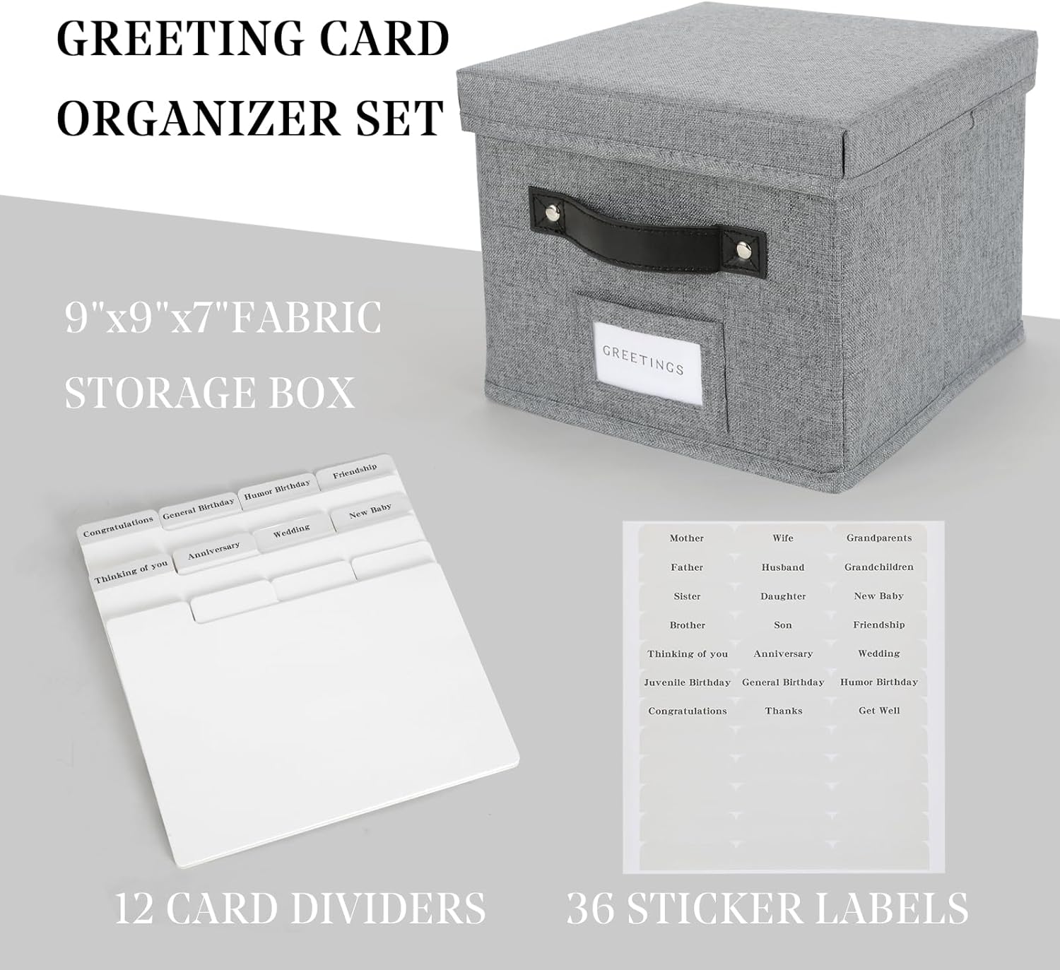 Greeting Card Organizer with dividers - Storage Box with lid Holds 150+ Cards - Assortment Box for Greeting Cards,Recipes, Photos, Envelopes, Keepsake - 9 x 9 x 7 Inches (Gray, 1 pcs)