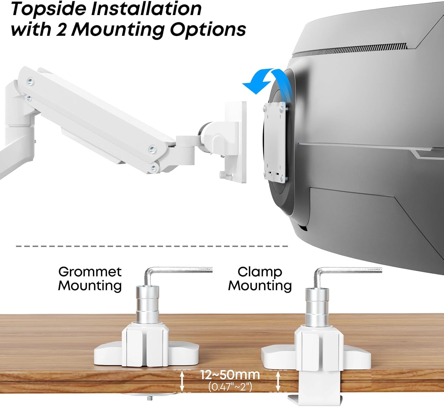 - Easy to Assemble: Step by step user manual and organized hardware kit for hassle free mounting.The detachable VESA mount with dual mount options. Desk required thicknesses for both C-clamp mount and grommet mount is 0.47" to 2". Delivery includes mounting kit and instruction manual