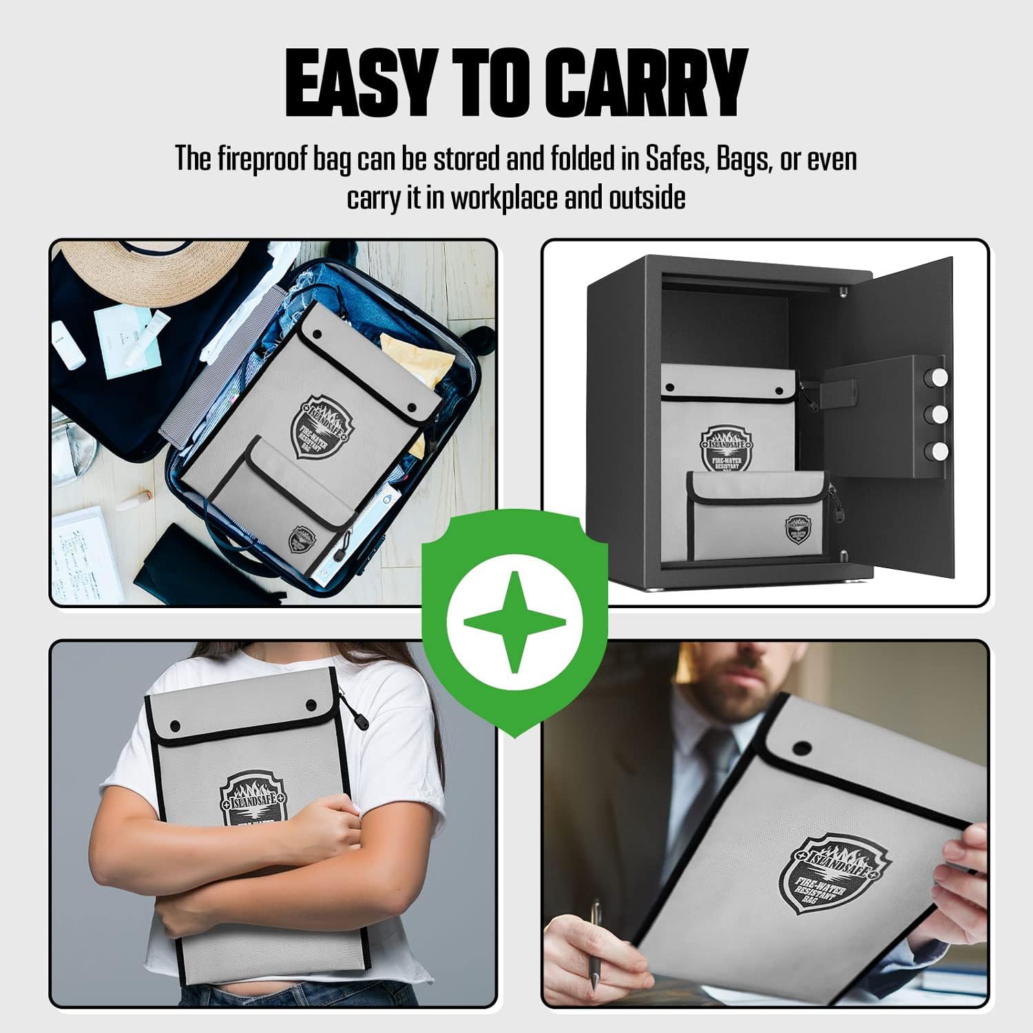 - đ„ăFOLDABLE AND PORTABLEăFireproof document bag is lightweight and can be easily folded, makes it easy to grab and carry on-the-go no matter at home, office or business traveling. Combining the use of fireproof money bag with fireproof safe box together is the best solution to offer your documents and valuables a complete protection in any fire accident.