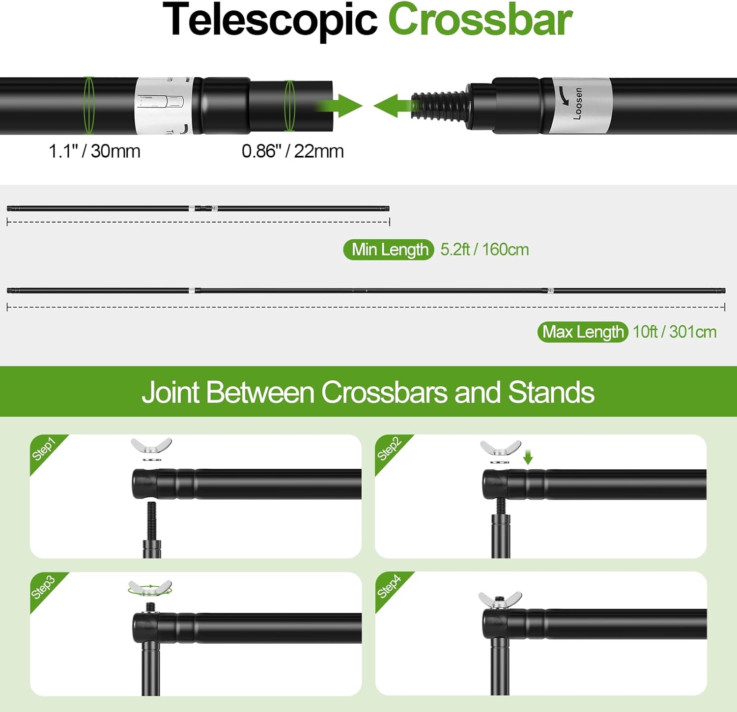 - Adjustable Backdrop Stand: With adjustable height (3.8ft-10ft / 45.6in-120in) and width adjustable (5.2ft-10ft / 62.4in-120in). The telescopic design allows you to flexibly adjust to the required size