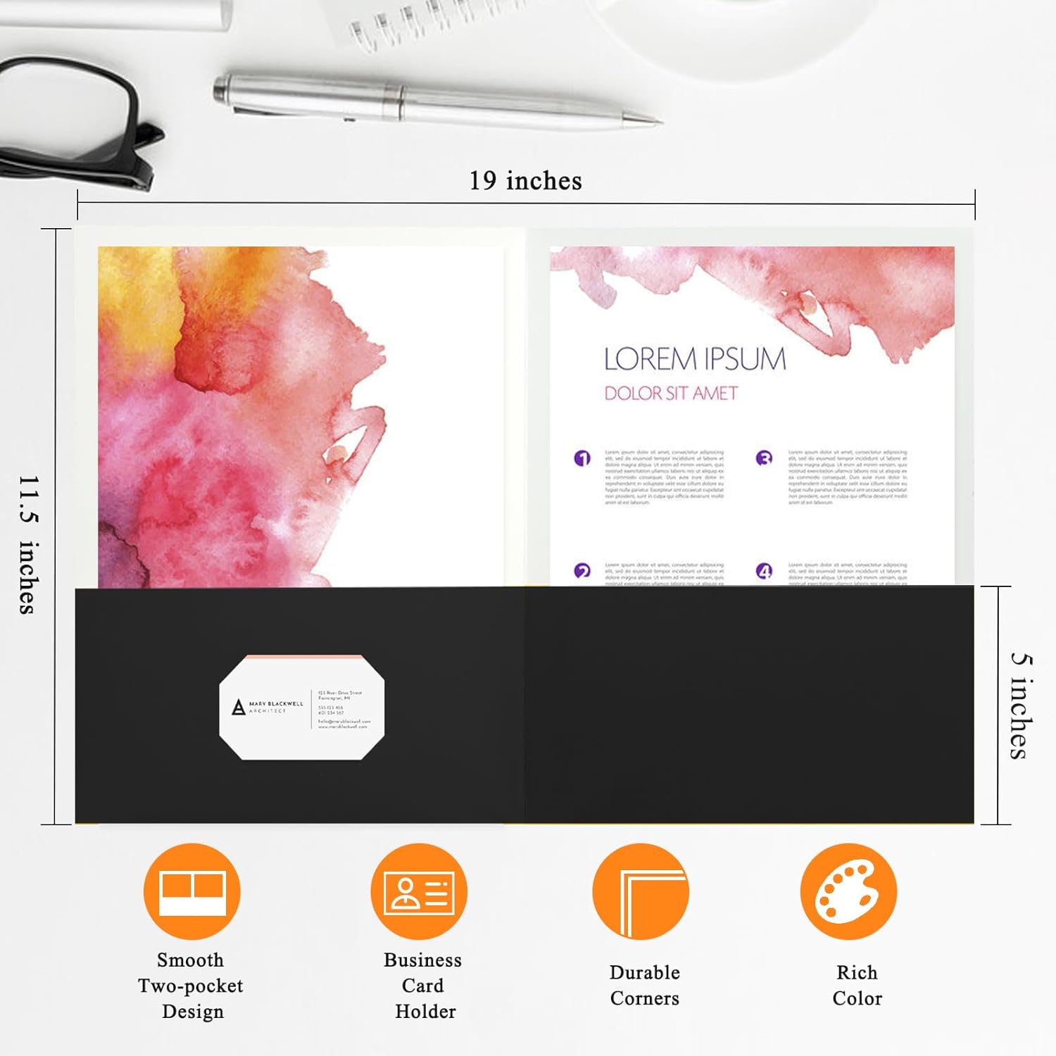 - KEY FEATURES: Two pocket folders with 5" pockets,Each pocket can hold up to 50 sheets,But can even handle more.Four-corner business card holder eliminates popout