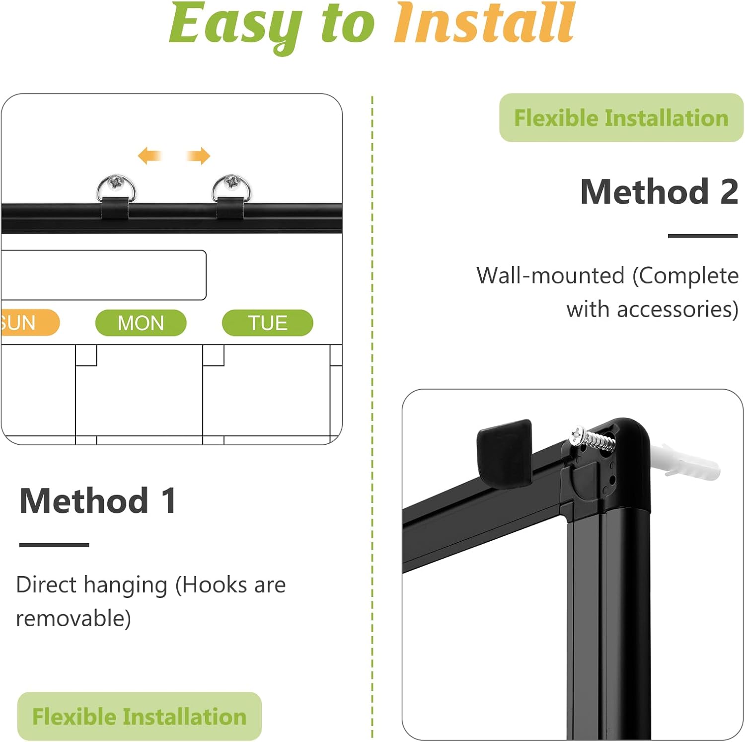 - 【2 Simple Installation Methods】: 𝑴𝒆𝒕𝒉𝒐𝒅 1 - Use the sliding hooks equipped with the calendar whiteboard for wall to hang directly to the wall; 𝑴𝒆𝒕𝒉𝒐𝒅 2: Use the screw holes on the corners of the frame to install. It comes with covers so it would look super clean with no visible screws. Installation is very simple and flexible, it can be hung horizontally or vertically according to your needs