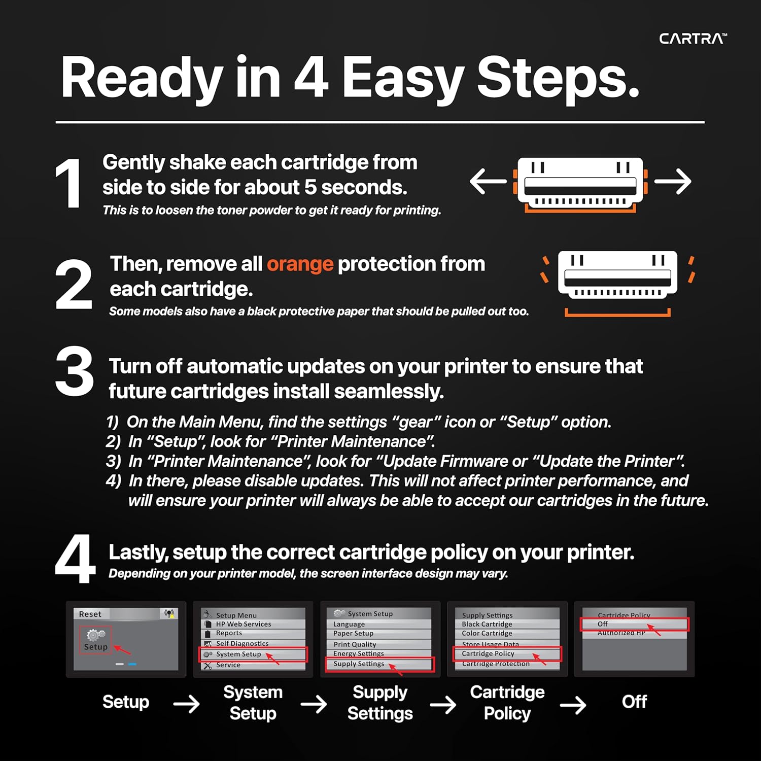- US-based customer support: Cartra provides robust customer support from their dedicated team based in the United States, ensuring quick and effective assistance for any issues or questions regarding their toner products, backed by extensive industry experience.