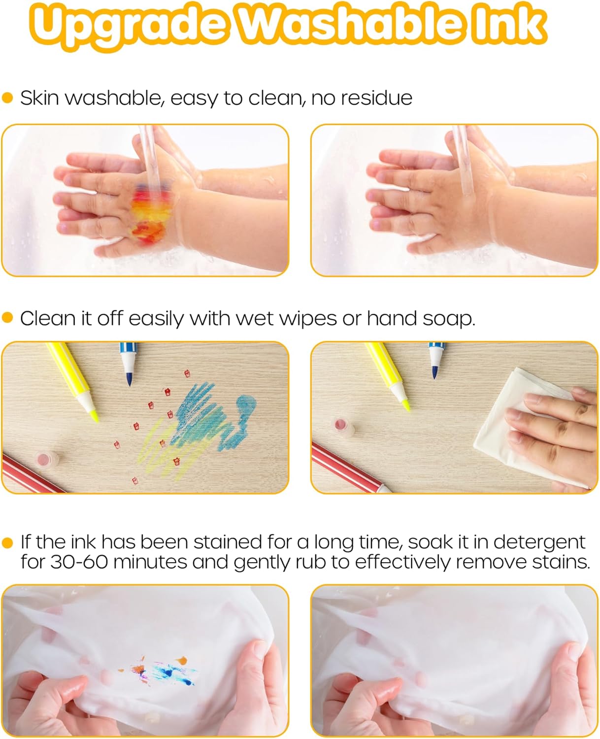 - Safe and Washable: These washable markers are made of friendly materials, giving you peace of mind. If there are any accidental spills or marks on clothes or furniture, they can be easily cleaned up. Let your kids explore their artistic side without any worries