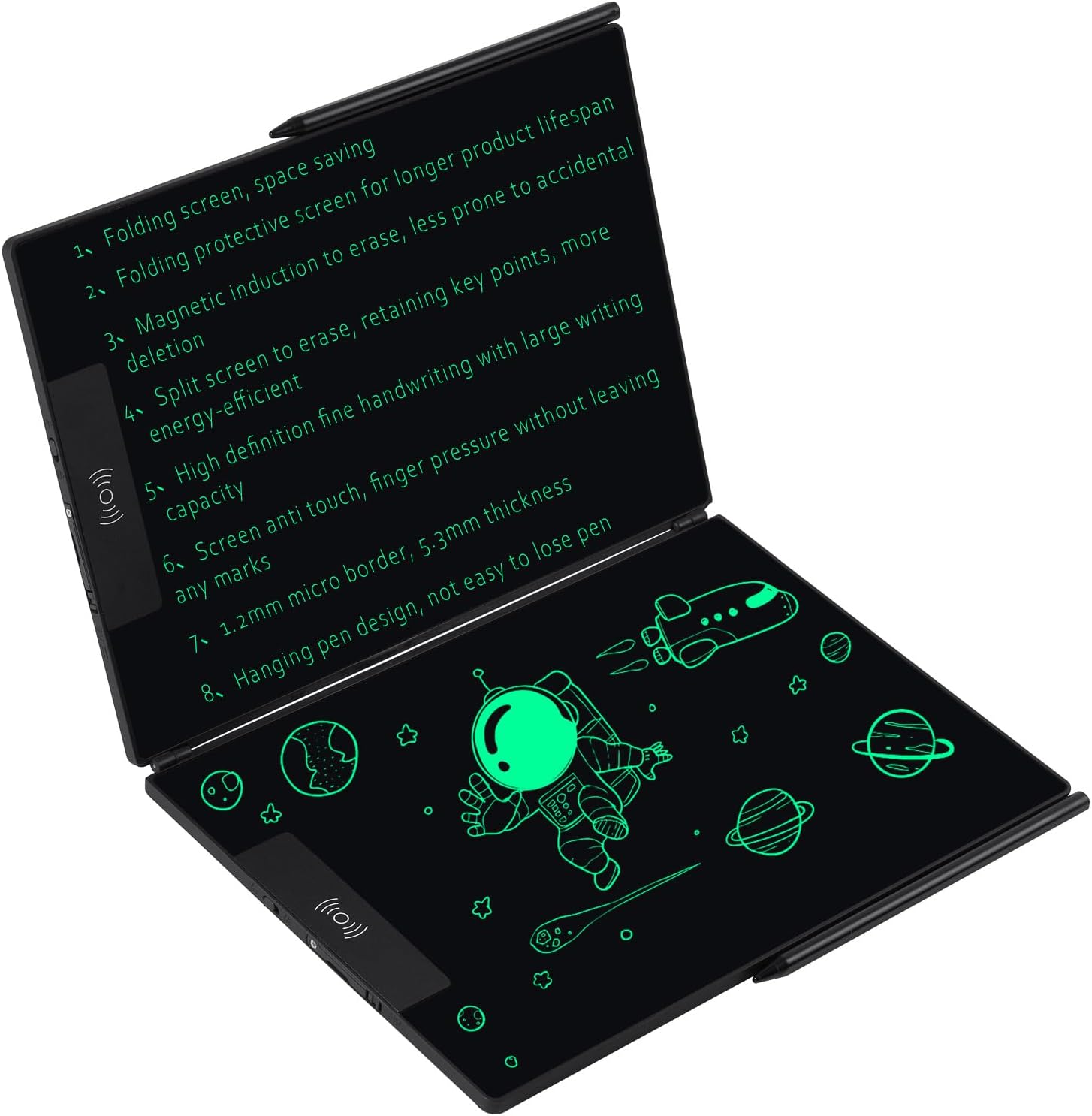 - Bigger Writing Space: The tablet offers an expansive writing space, providing more room for content compared to traditional 16-inch LCD writing tablets. The new cleaning button design prevents accidental activation, while the edge structure stabilizes the pen more securely than magnetic alternatives, ensuring a steadier writing experience. These improvements enhance the tablet's overall usability and writing capabilities.