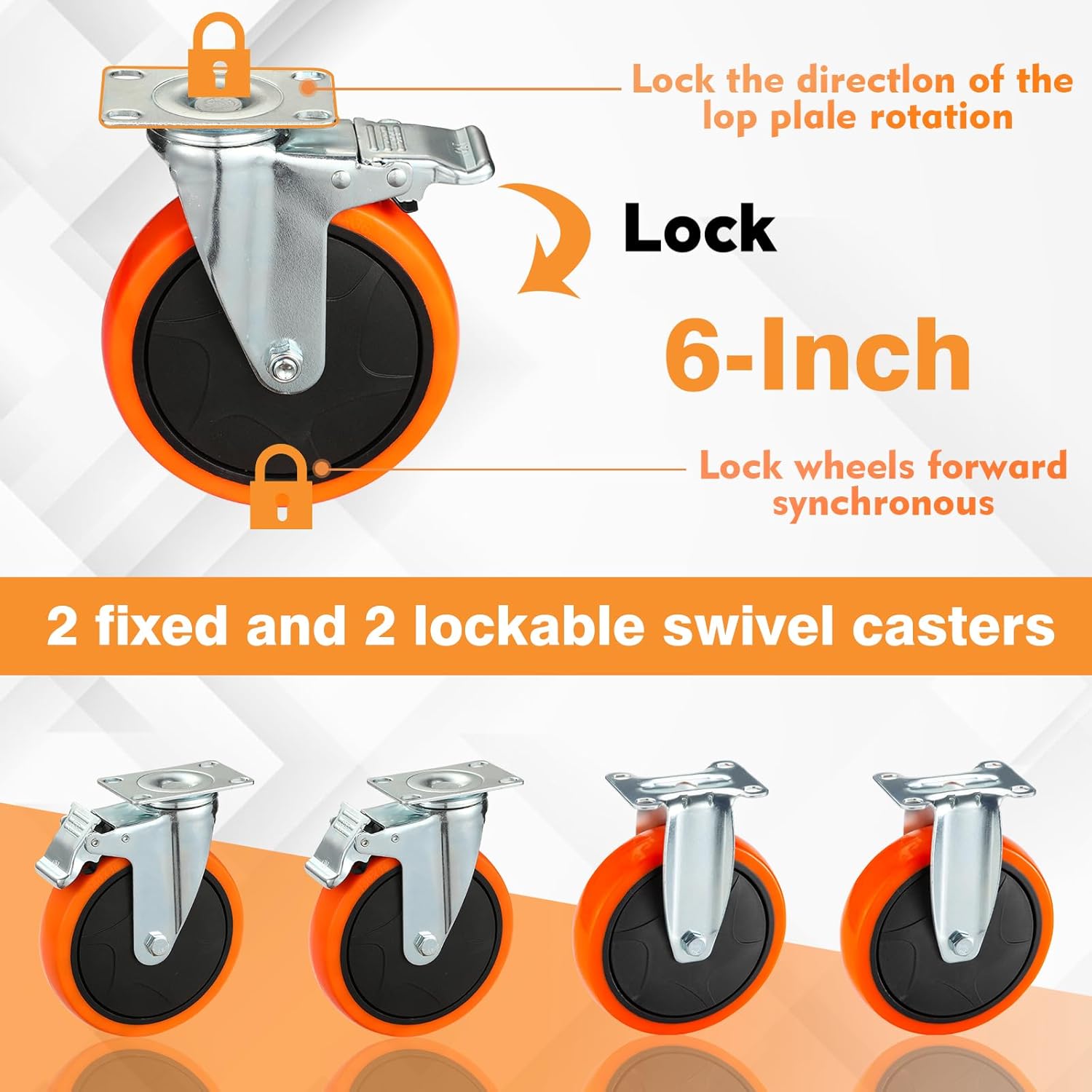 • ๐Ÿ”† PROFESSIONALLY DESIGNED WHEELS: 2 fixed and 2 swivel 6-inch wheels (2 with Brake) are made of industrial-strength polypropylene and non-marking polyurethane (PU) rubber. The swivel wheels can easily rotate 360 degrees flexibly, and the inner double ball bearings make the rotation and rolling more effortless and labor-saving. The locking mechanism synchronously locks the rotation and the wheel frame, thus achieving effective and fast braking.