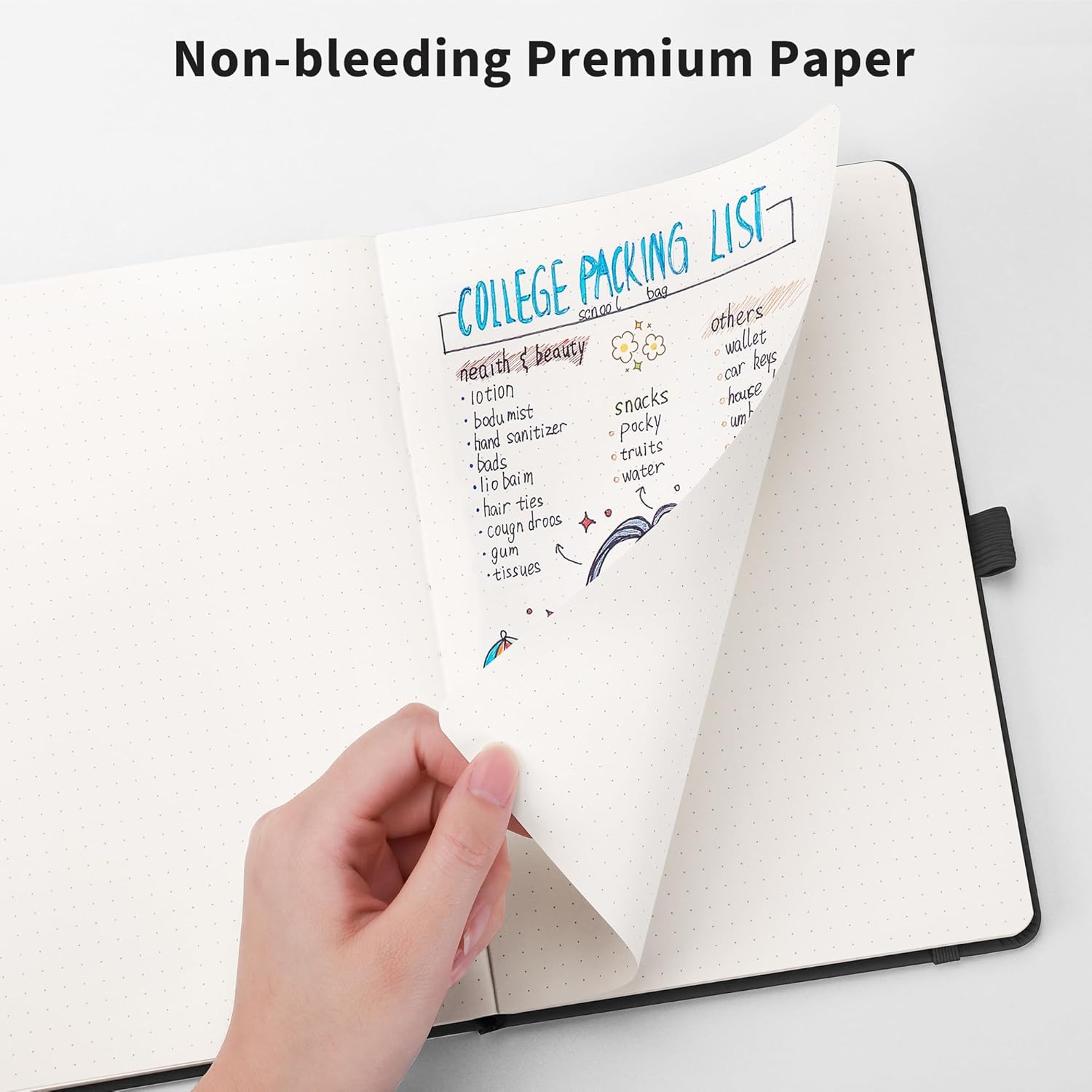 - PREMIUM PAPER: Crafted with time-resistant 100 GSM paper, this dotted journal preserves thoughts flawlessly while resisting ghosting/bleed-through with most pens. Acid-free material ensures long-term preservation, and its smooth surface enhances writing clarity - blending durability and premium performance