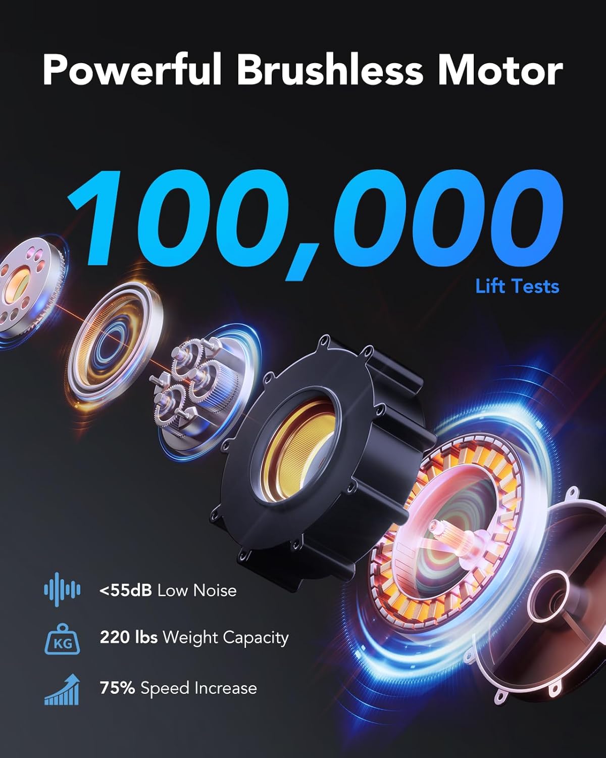 - ăQuite & Faster Brushless Motor ïŒ55 dBăEquipped with a powerful brushless motor, this adjustable desk delivers 75% faster lifting speed while maintaining a quiet operation at less than 55 dB. Tested for over 100,000 lift cycles, th e sit to stand desk ensures excellent stability and long service life.