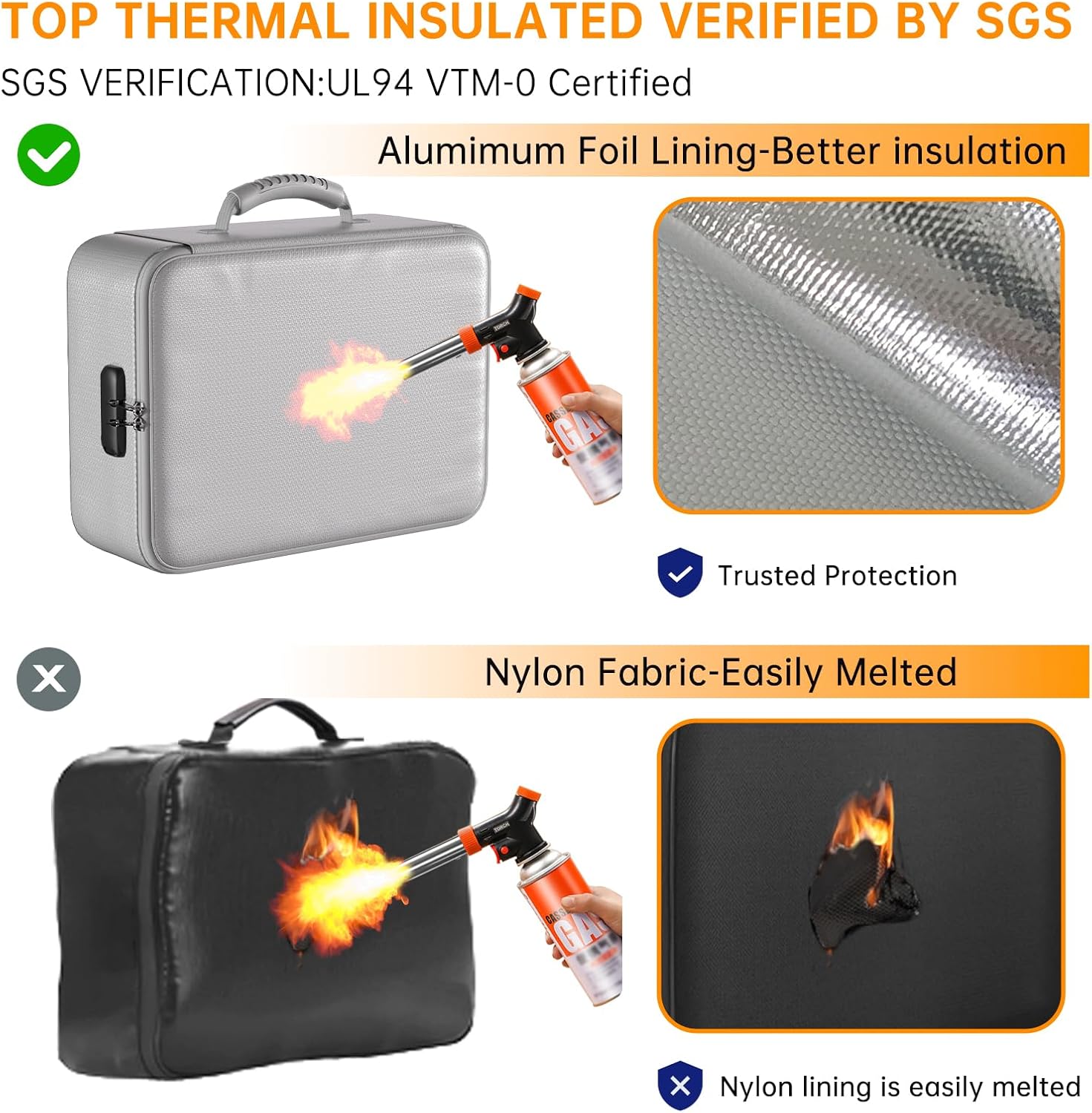 - Combination Lock Protection: Compared with other bags,our 5200°F fireproof document organizer can lock files and items inside the bag for safety. High-quality password lock provides maximum security for your valuables such as contracts, cards, certificates, conference materials, passports, etc. More wider strap handle design on the back allows you to insert a suitcase handle. Fireproof bag for files is sealed with professional waterproof zippers that can withstand high speed spray of fire hose
