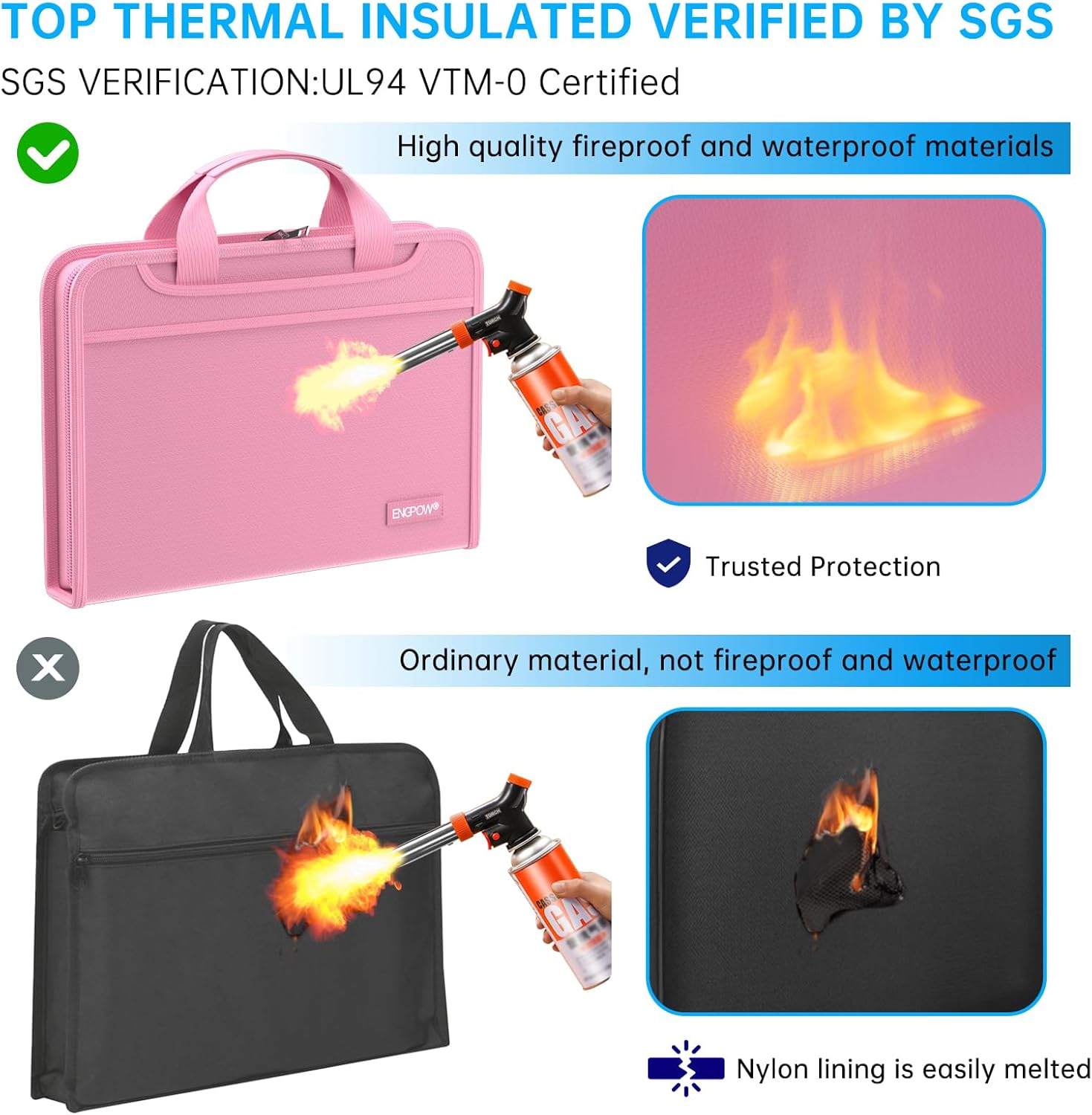 - High-Quality Materials: Protect your files with ENGPOW fireproof accordion file organizer.It is made of 3-layered non-itchy silicone-coated fiberglass which withstand the temperature up to 2200℉.It has been passed by SGS TEST(UL94 VTM-0 Certified).Fireproof File Folder is fireproof&Water-resistant,which can effectively protect your important documents in a fire,flood,and wet weather. They will further keep your files intact.Giving you time to save your important documents when disaster strikes