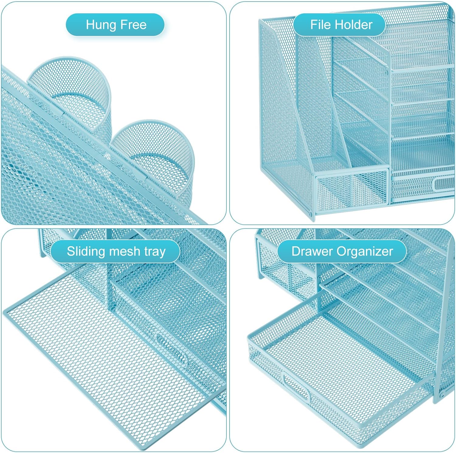 Marbrasse Desk Organizer with File Holder, 5-Tier Paper Letter Tray Organizer with Drawer and 2 Pen Holder, Mesh Desktop Organizer and Storage with Magazine Holder for Office Supplies(Blue)