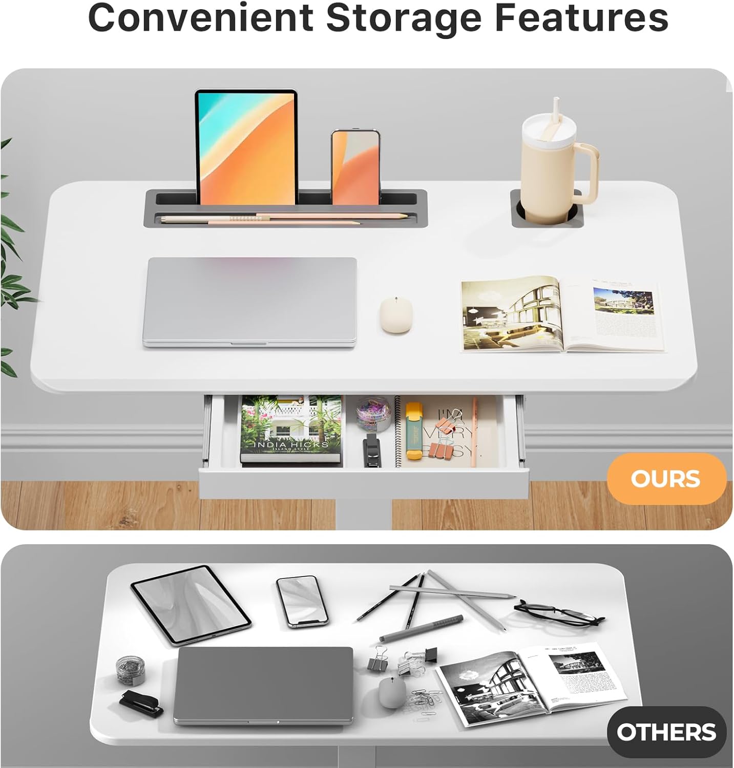 - Convenient Storage Drawer: Small standing desk features a drawer (Size: 14.4"×8.4"×1.3") that offers generous storage for office supplies, helping maintain a clean workspace. Additionally, 2 hooks design facilitates organization of headset or backpack