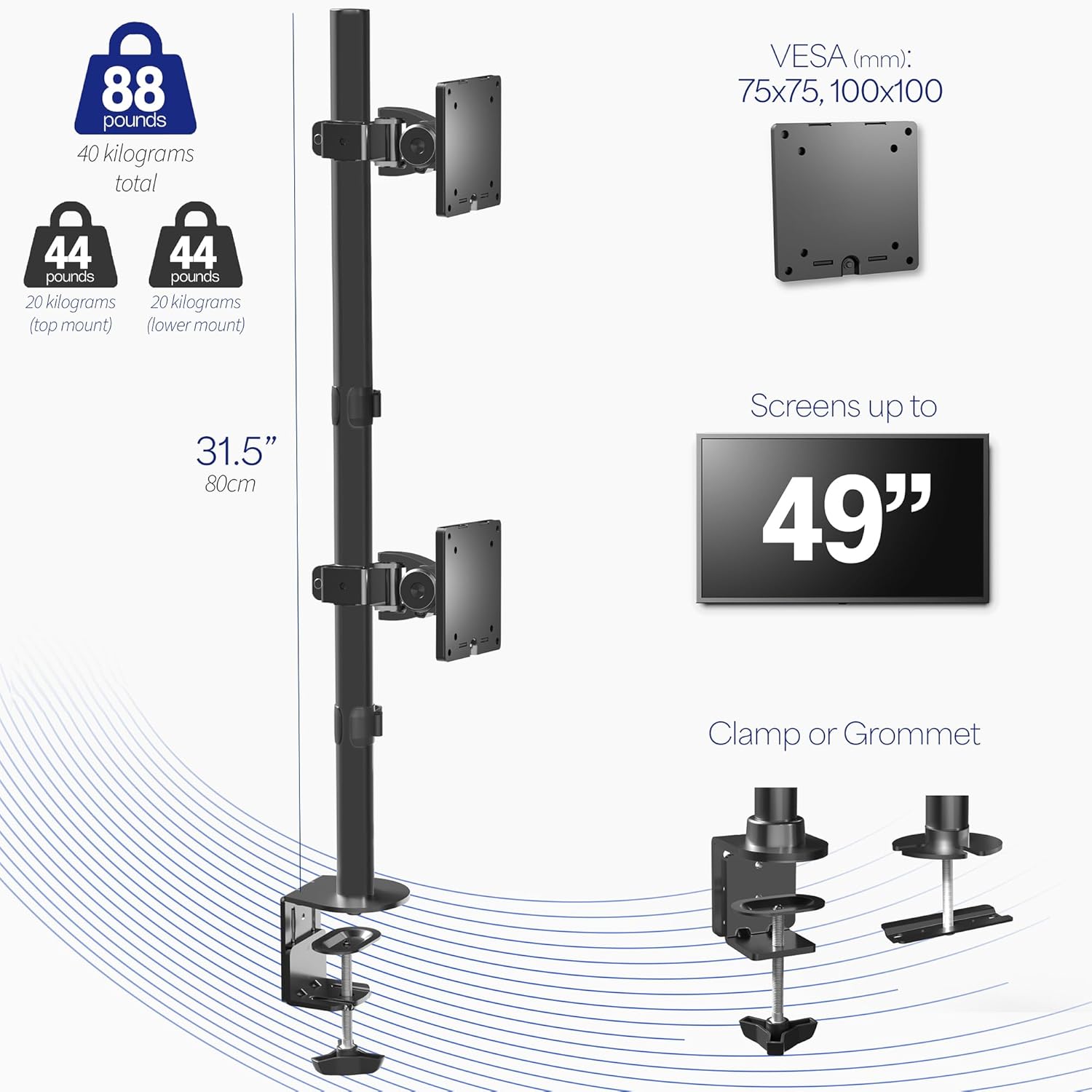- Ultrawide Compatibility: Vertically stacked, sturdy steel dual monitor mount fits 2 ultra-wide screens up to 49” in size and 44 lbs in weight (each) with VESA 75x75mm or 100x100mm