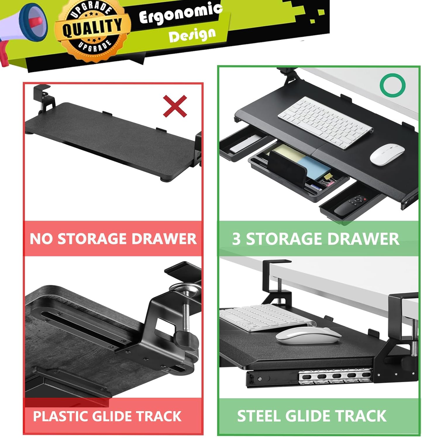 - ERGONOMIC KEYBOARD TRAY: It’s essential to have the right posture to protect your wrist, arms, neck, and shoulders when you’re at your desk. An underdesk keyboard tray promotes an optimal typing position. It ensures you sit safely and can protect against neck and shoulder pain, wrist strain, and even RSI