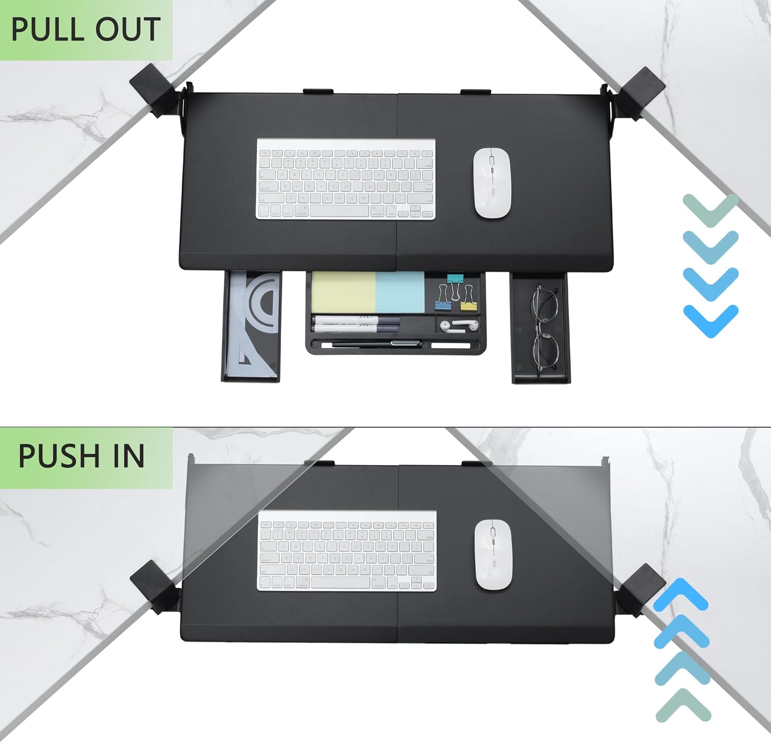 - EXTRA LARGE SURFACE & 3-DRAWERS: ETHU desk keyboard tray measures 26.77”(L) x 12.2”(W) and supports up to 22 lbs. There are three drawers. They double up as smart storage for your keyboard, and mouse with extra room to spare for your phone, and other items and free up your desktop. It is a clever solution for small offices or when you’re working from home