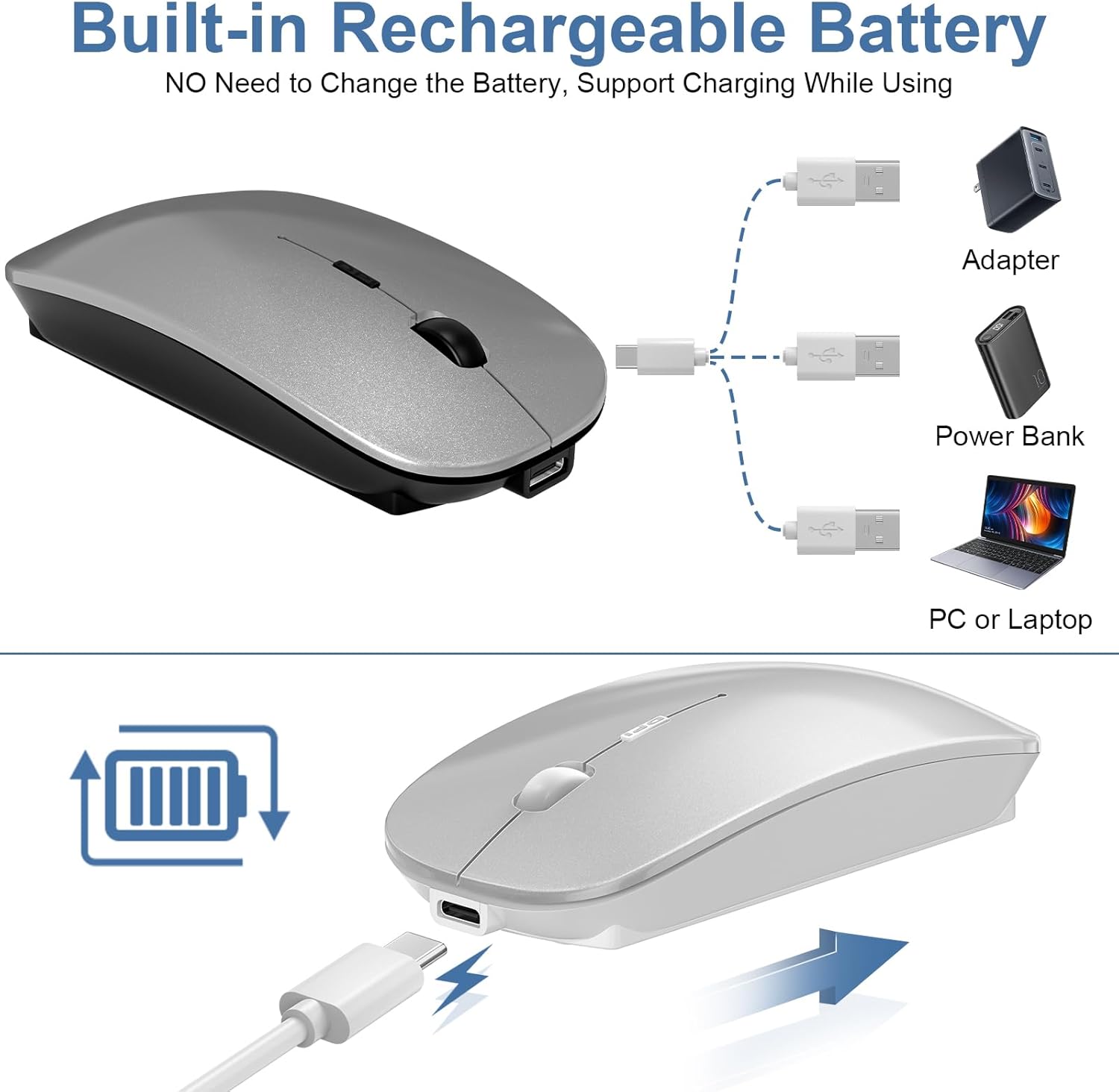 Mouse for Laptop Wireless Bluetooth - MacBook Air Mac Pro PC iPad Optical Rechargeable Silent Mouse with Jiggler Dual Mode Switch Bluetooth 5.2/3.0 and 2.4GHz USB-A and Type-C Receiver Gray