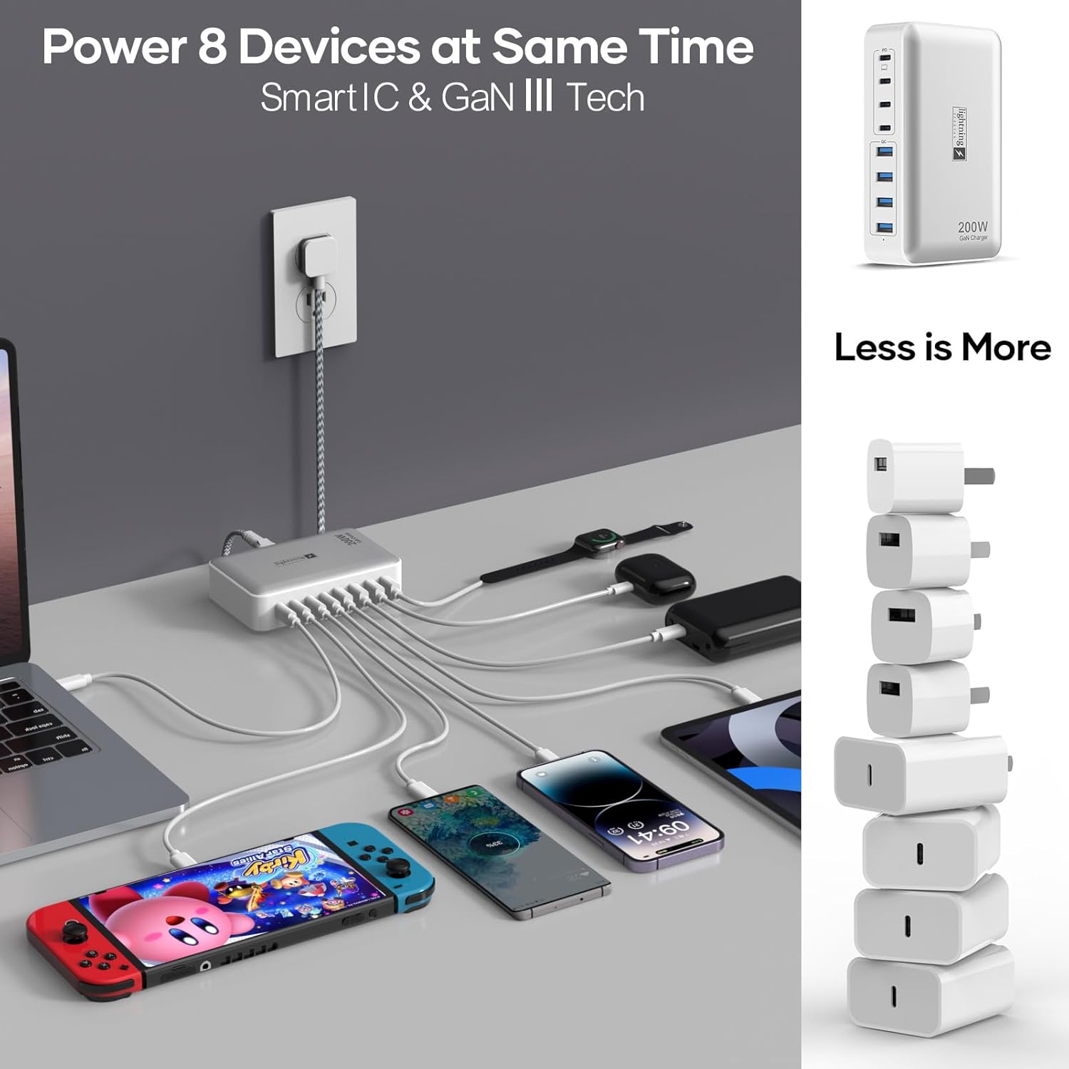 - Powerful Charging: This GAN charger features a total power output of 200W, with 4 Type C ports and 4 USB A ports, allowing you to charge multiple devices simultaneously.