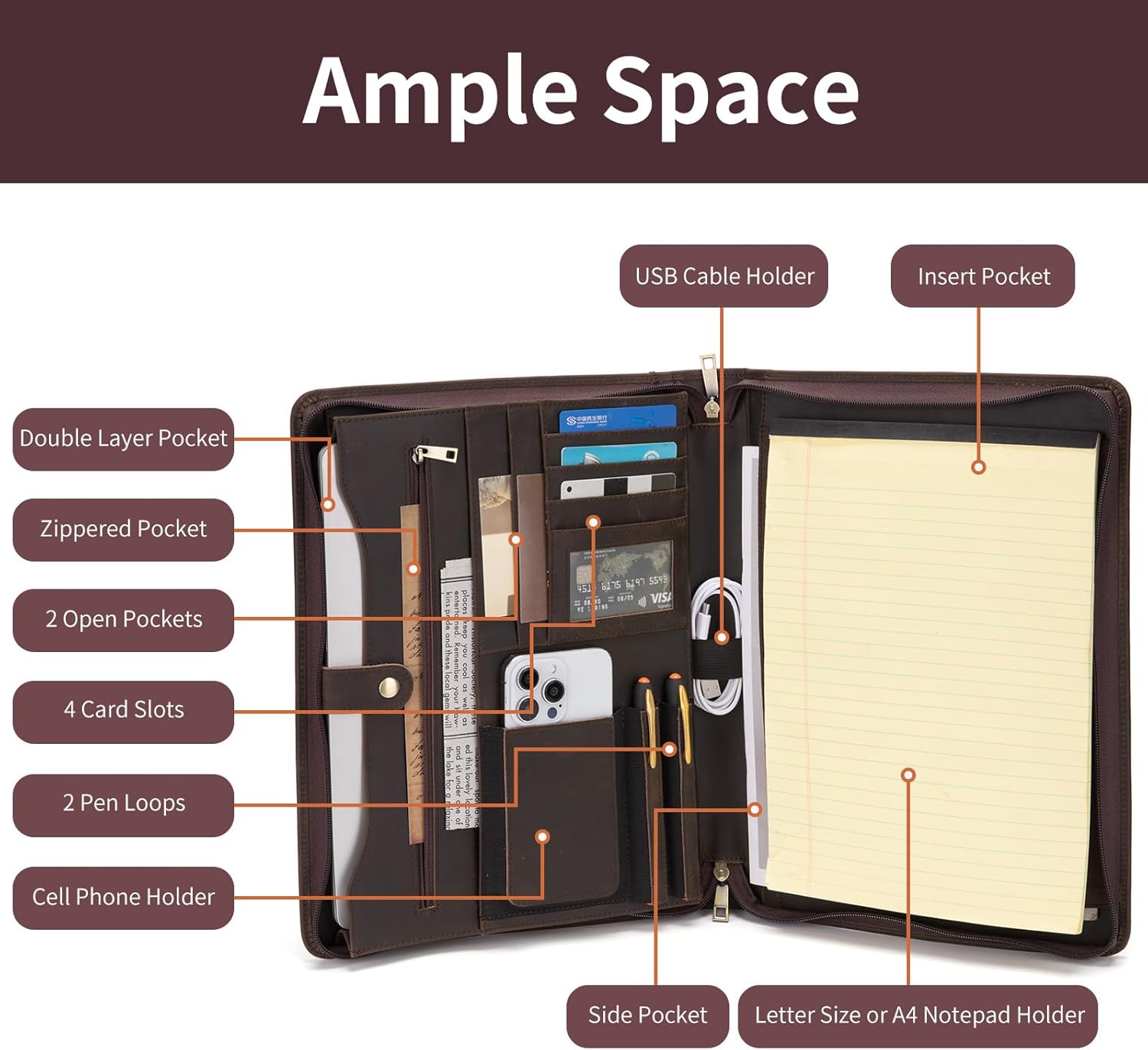 - Enhanced Organizational Layout: This portfolio is equipped with a cell phone holder, two pen holders, and four card slots, ensuring all your essentials are easily accessible and neatly organized. The inside zippered pocket provides additional secure storage for valuables, while the durable YKK dual zipper ensures smooth and reliable closure. With these thoughtful features, you’ll be prepared for any situation, all while maintaining a sleek and professional appearance.