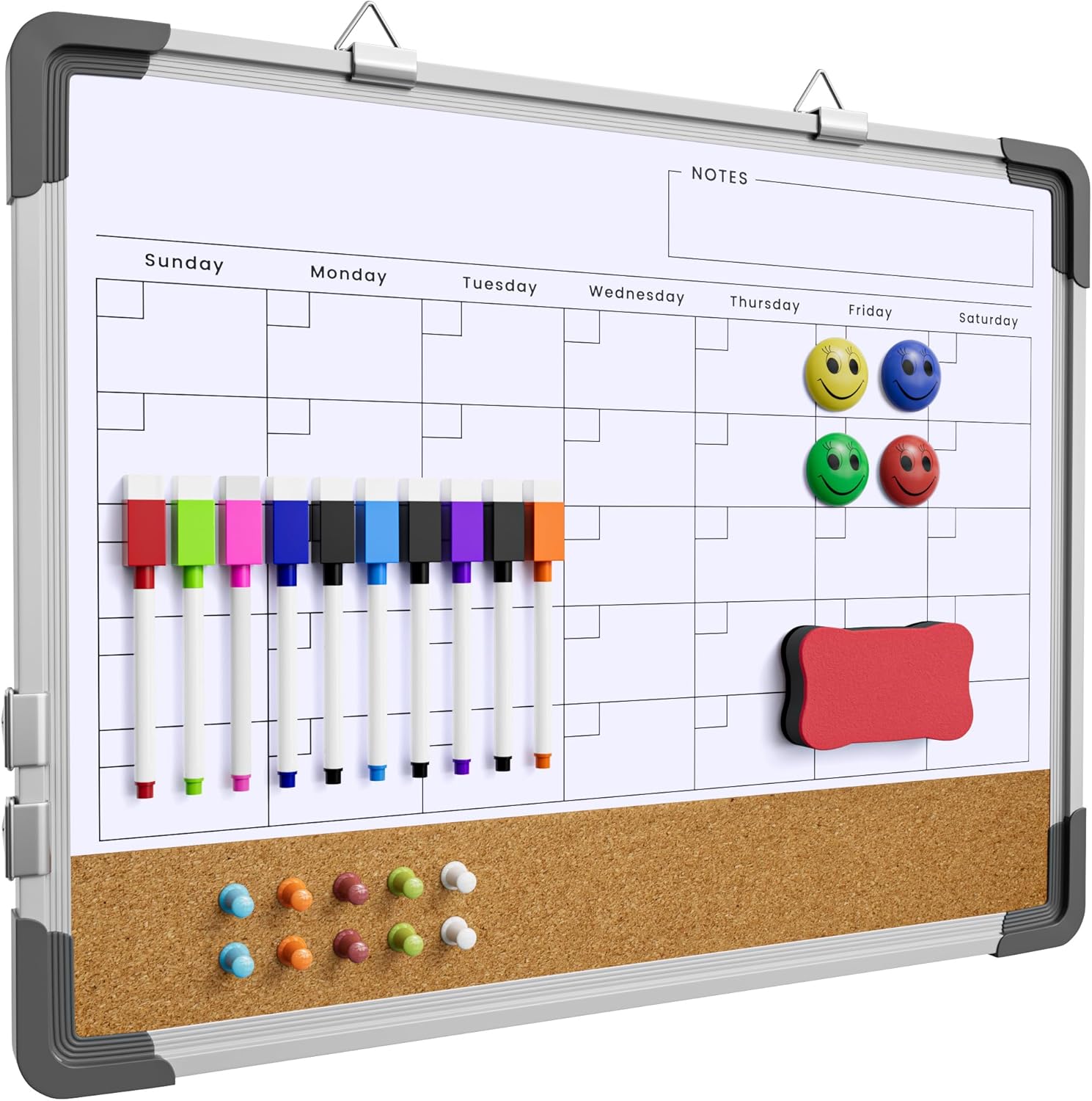 - 3-in-1 Dry Erase Board&Cork Board: The dry erase calendar helps you to keep track of your time, dates, and appointments in visual ways, corkboard at the bottom is great for receipts, tickets, notes, lists, pictures, etc. The magnetic whiteboard calendar have double-sided design, allowing you to have two projects going on. The front side is printed with an undated monthly calendar grid, you can write down dates, monthly schedule and make to do list plans. The other side is blank, it is perfect for school home teaching or memo, you can hang on the wall to jot down upcoming events, deadlines, appointments, projects, and important reminders.
