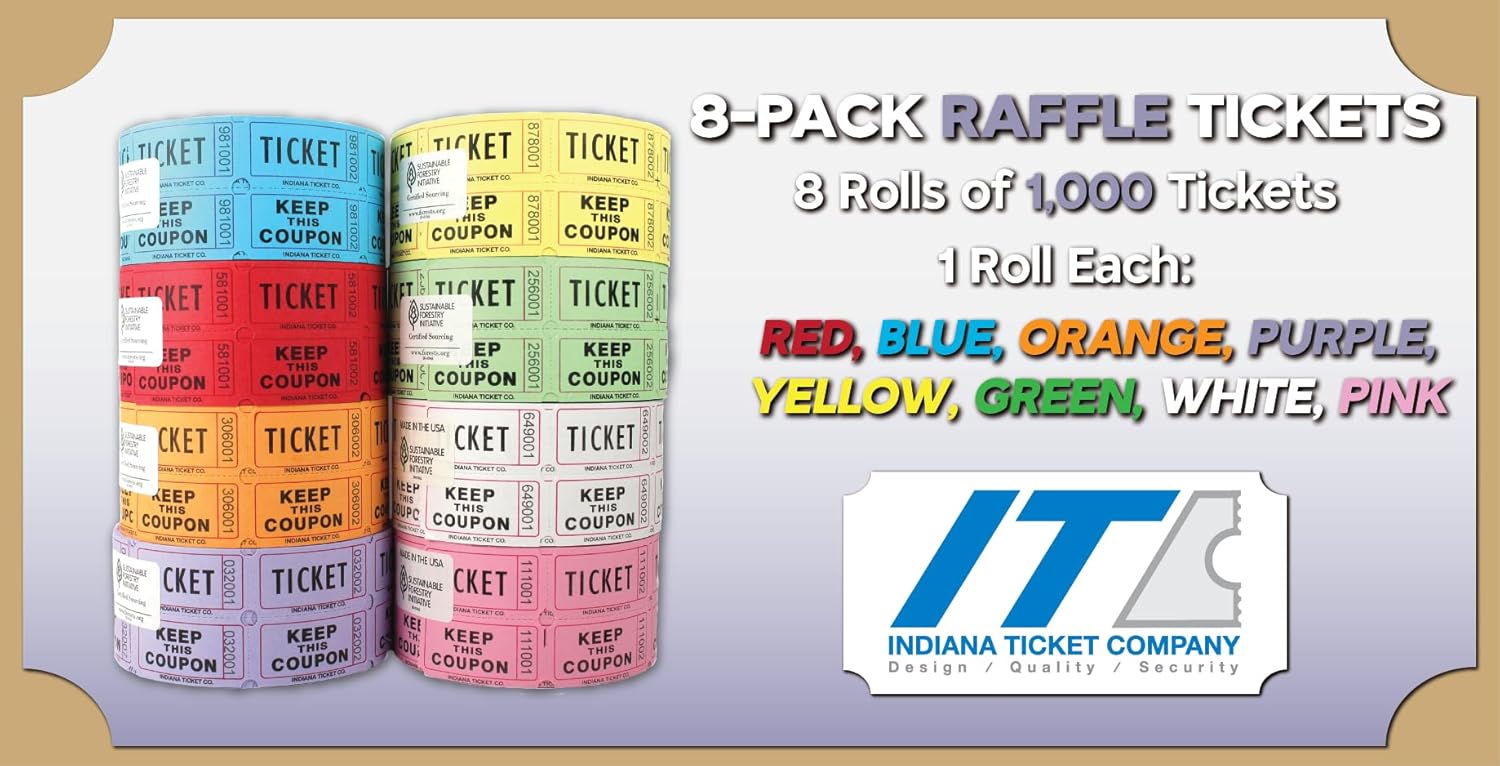 - BRIGHT COLORS βThis 8-Pack includes 1 Roll each Red, Blue, Orange, Purple, Green, White, Pink & Yellow. Each INDIANA TICKET CO. roll includes 1,000 raffle tickets. The tickets are 2β x 2", separated into two 1βx 2" portions.