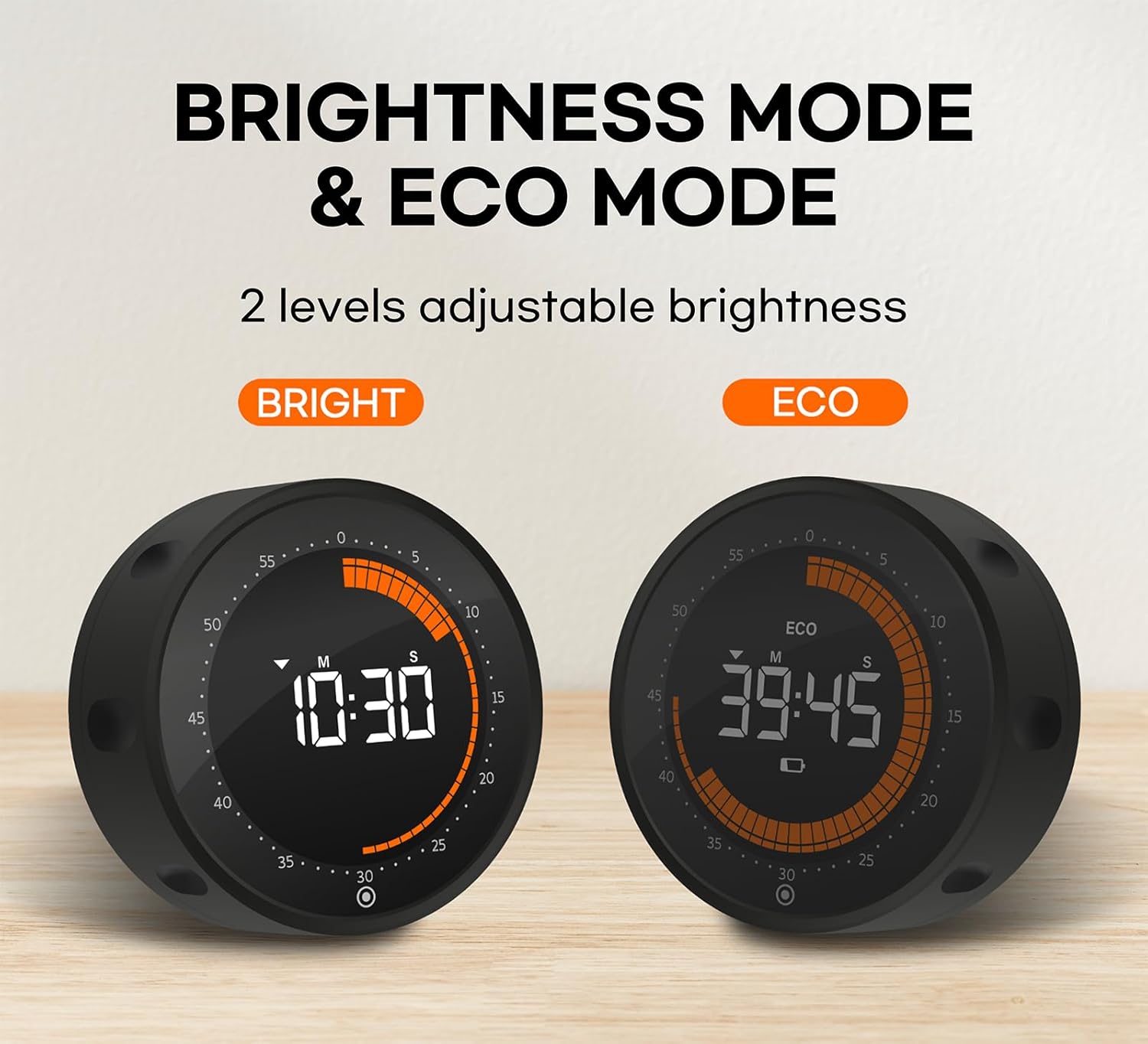 - 【 2 BRIGHTNESS MODES 】 This digital timer has 2 brightness modes adjustable ; The constant brightness mode make it easy to read the timing from a distance, such as in large room or classroom. The ECO mode reduces the brightness to save power and is suitable to use in a near distance. When not in use, both modes will automatically turn off the screen to save energy and extend battery life.