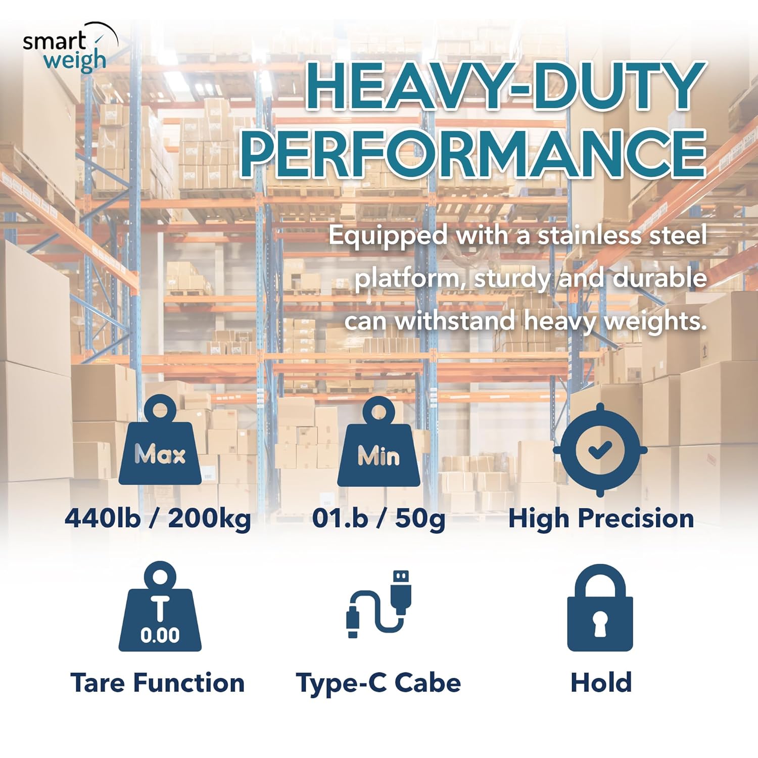 Smart Weigh 440lbs x 2 oz. Pro Digital Shipping and Postal Scale USB-C or Battery Power with Wide Stainless Steel Large Platform, UPS USPS Post Office Postal Scale and Luggage Scale