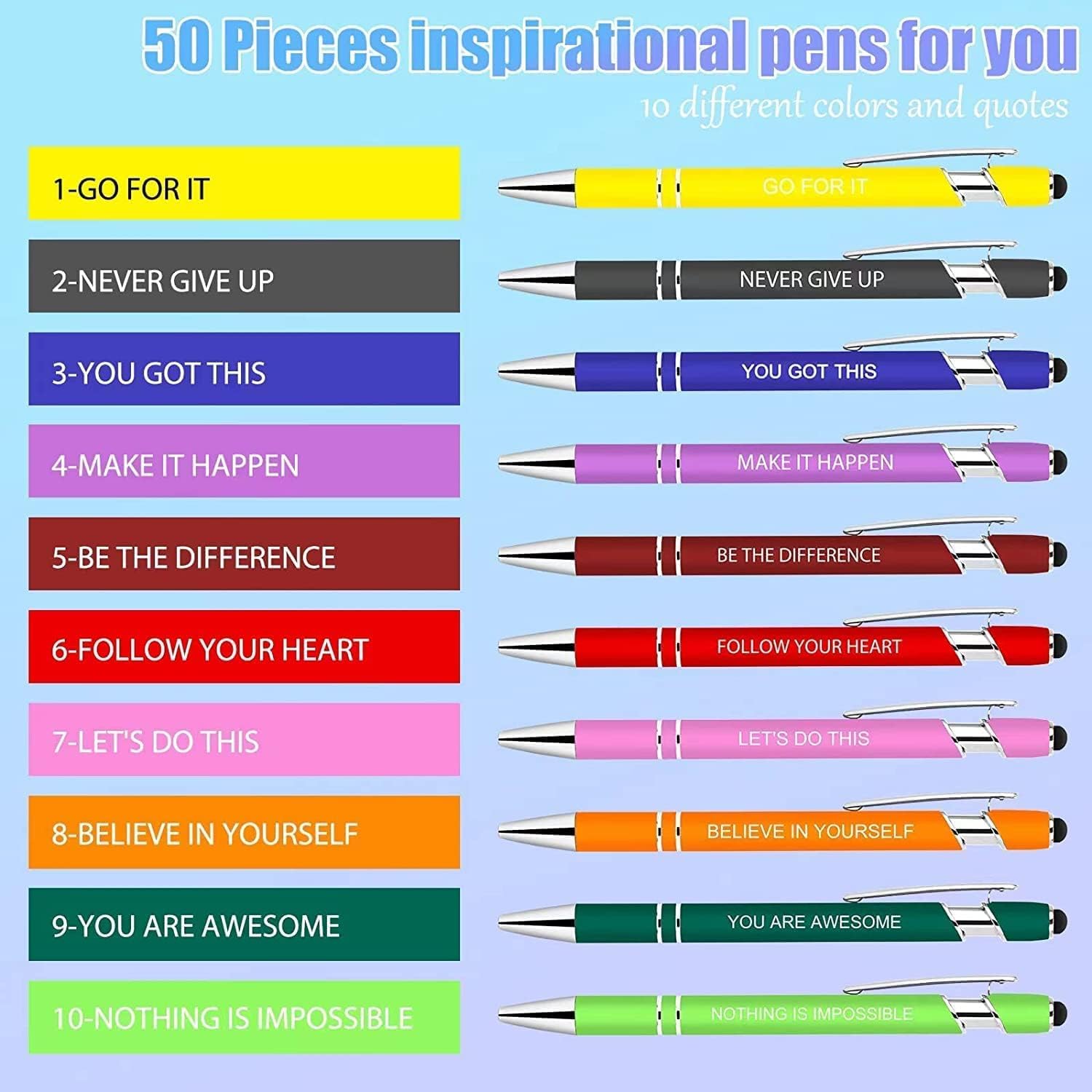 - Quotes That Ignite - Each encouraging pen bears an empowering phrase like "GO FOR IT", "NEVER GIVE UP", igniting your drive. These colorful, stylus-tipped cute pens crafted from premium materials will fuel your spirit for years to come.