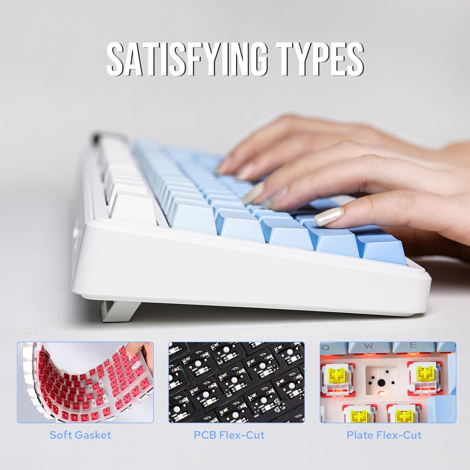 - Gasket Structure&Five Layers of Sound-Improving Materials: The F99 PRO mechanical keyboard adopts a gasket structure, extended integrated silicone pad, and PCB flex-cut to optimize elasticity and stability, providing a softer and more elastic typing experience. Equipped with 5 layers of sound-dampening materials, it enhances the acoustic effect of typing. The combination of sandwich foam, IXPE switch pad, PET sound-improving film, bottom foam, and silicone shell pad helps eliminate echo and provides stable and comfortable typing sound