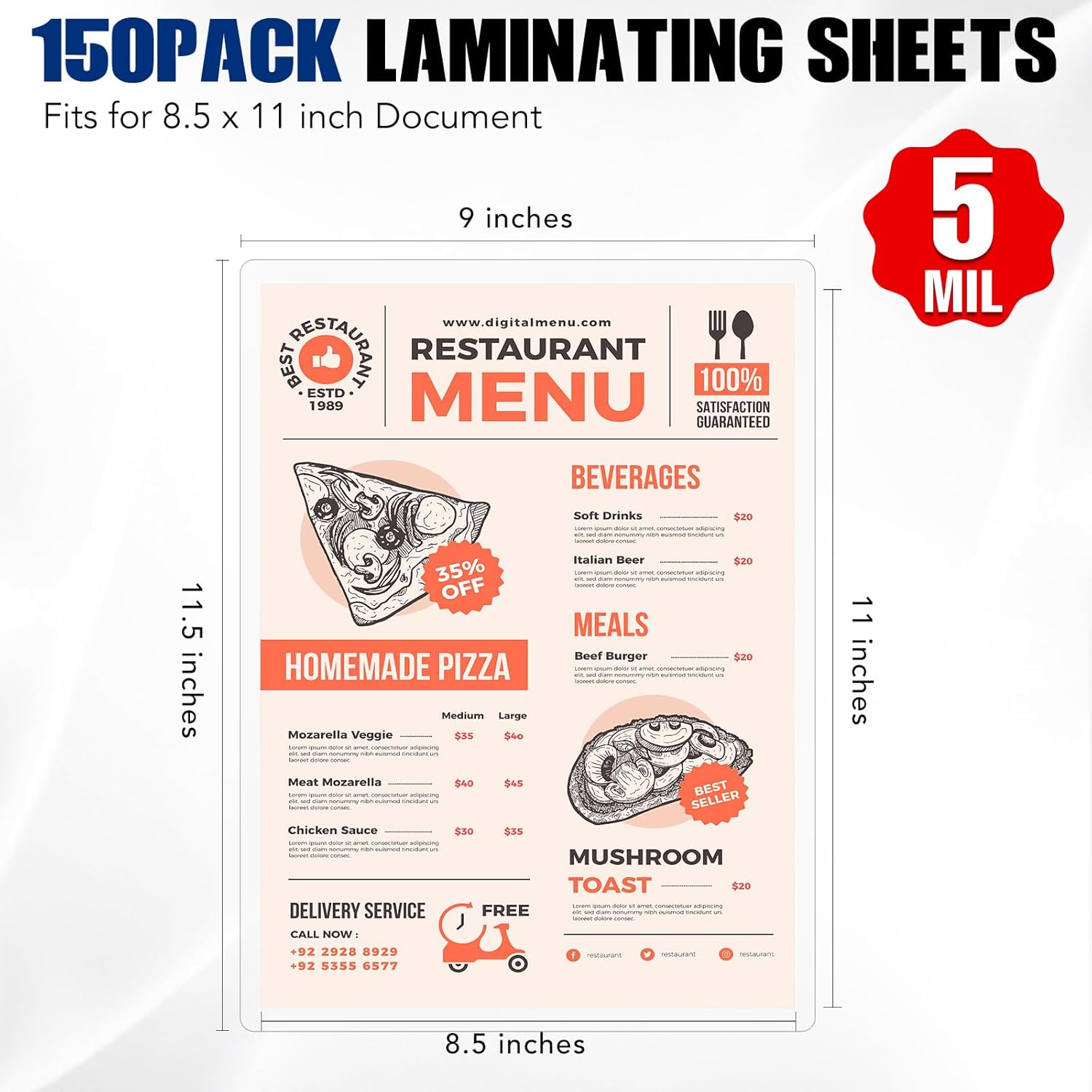 - LAMINATING POUCHES DIMENSIONS: 150 PACK, 9" x 11.5",5 Mil thickness. Compatible with all thermal laminator machine brands. Suitable for letter-size files up to 8.5 x 11 inches.