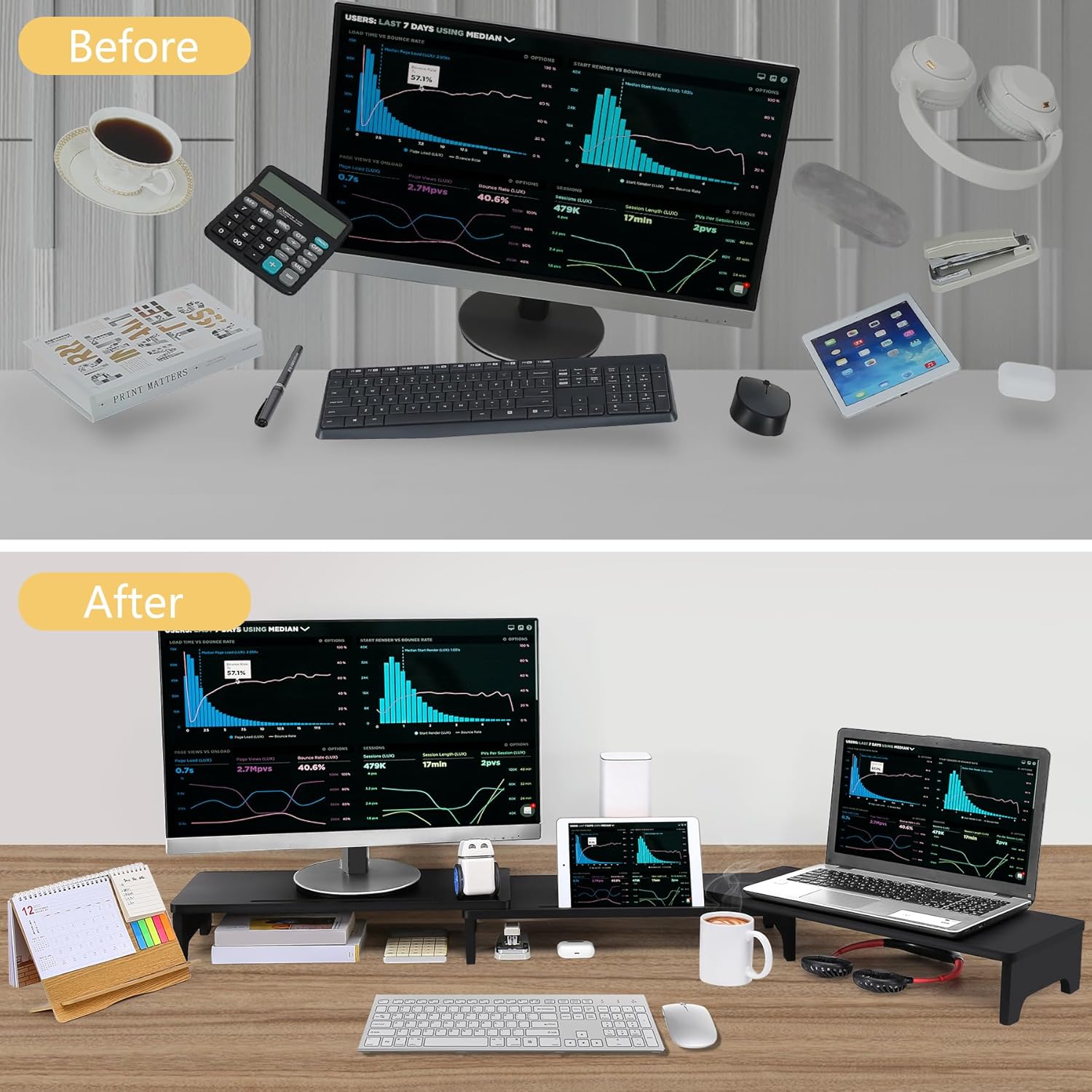 - 【Screen riser with Adjustable Length & Angle】Three fix holes for adjusting the length.The minimum and maximum length of the monitor riser is about 43.3in and 60.7in.The angle of the left and the right shelf can be adjusted according to the desk corner construction and the size of computer screen. Helping you organize the desk reasonably,and find the most comfortable posture during long-time work, ease your neck and back.