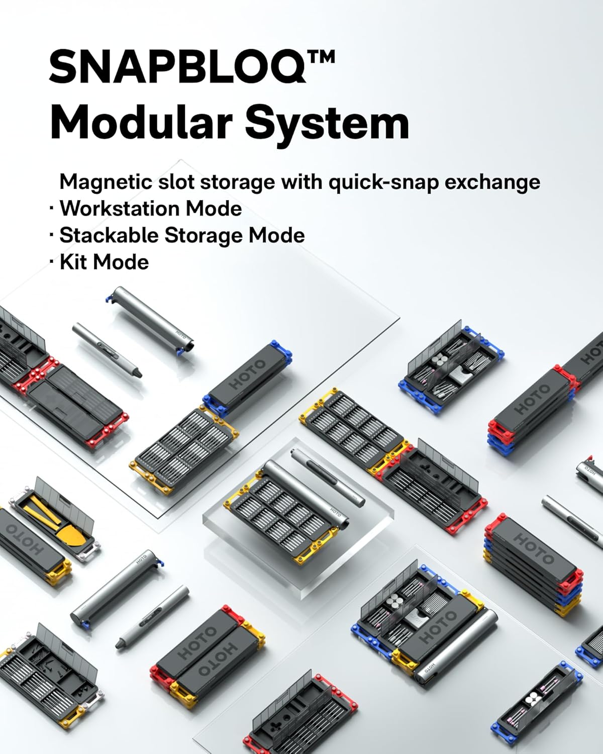 - SNAPBLOQ Modular Ecosystem: Transform your toolkit in seconds by switching between workstation, storage, and portable modes via magnetic quick-release connections. The future-ready design lets you start with a precision screwdriver today and expand into a full micro-workshop tomorrow