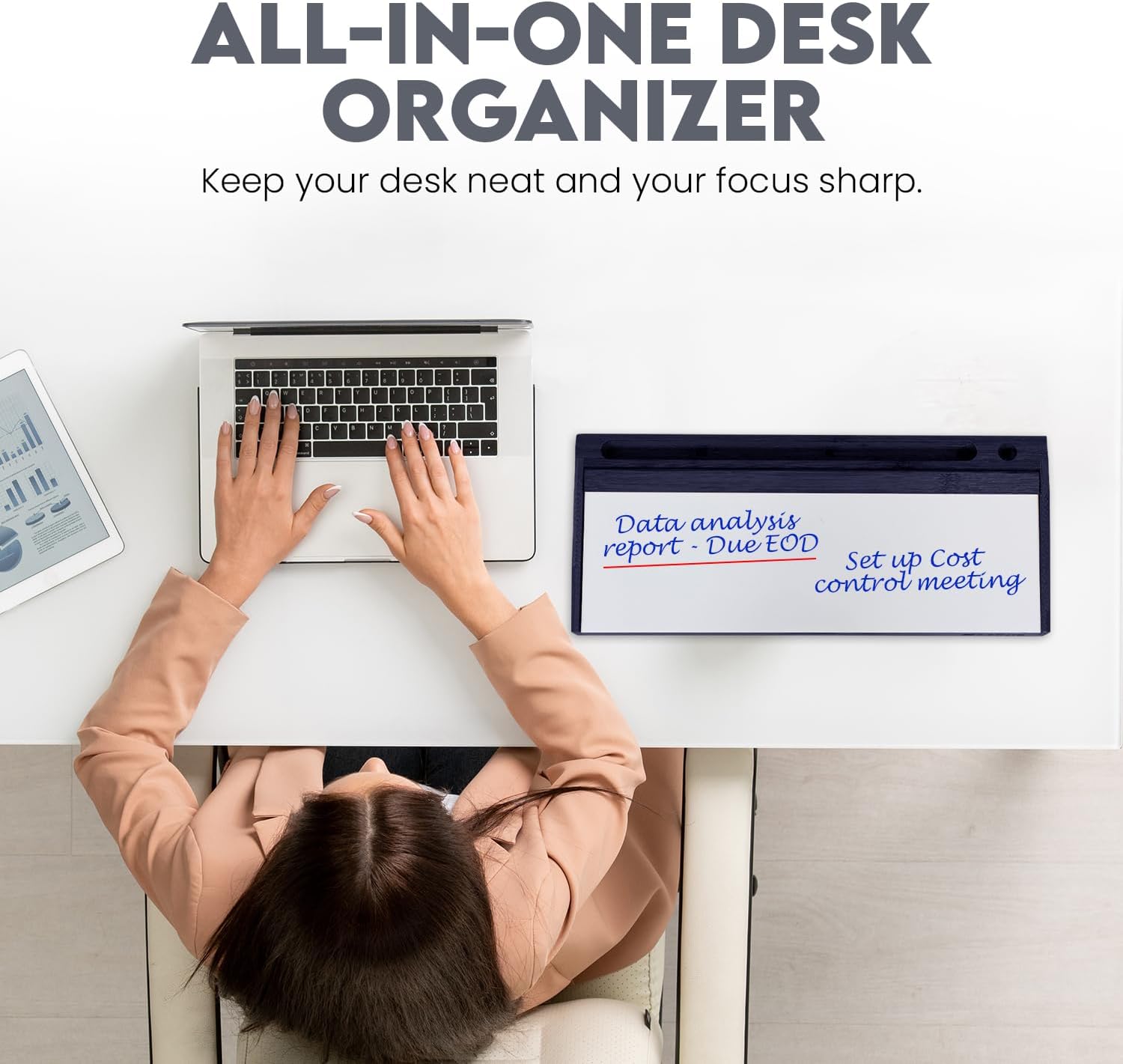 - All-In-One Bamboo Desk Organizer: Our desktop whiteboard with storage holds your phone, has storage compartments for your office must haves, and a dry erase board for memos, meetings, or studying.