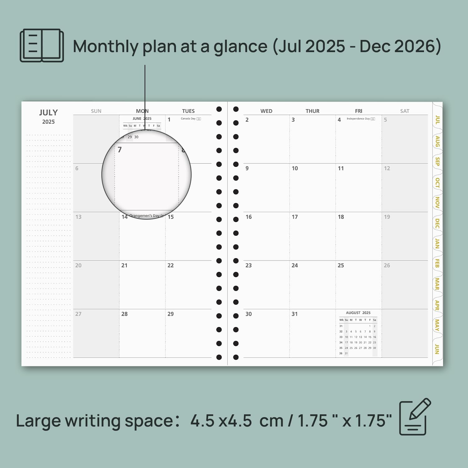 - 2 PAGES PER MONTH: This 18-month planner (Jul.2025 - Dec.2026) presents a spacious and unique calendar-like design, each month has a 2-Page spread with dotted notes and to help you manage deadlines and goals effectively.
