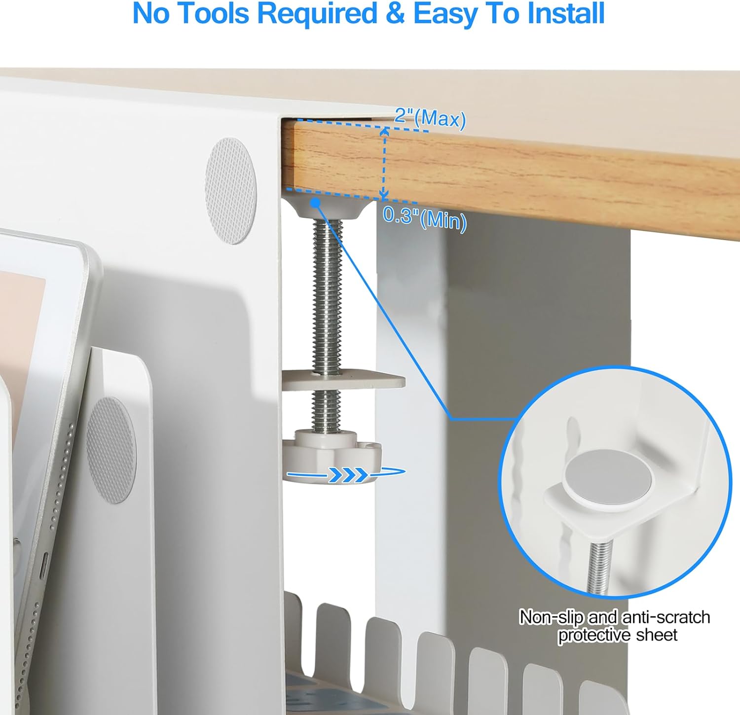 - ăClamp Under Desk Storage & No Drill DesignăOur clamp on side desk storage requires no drilling or tools. The rubber cushion prevents scratches on desks and other objects, and the rounded corners design also helps avoid scratches.