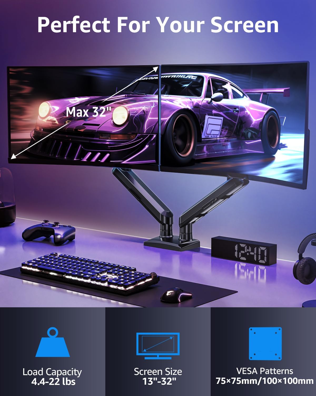- Universal Compatibility:The dual monitor stand perfectly fits most flat or curved LCD computer screens 13"- 32".Each arm supports a weight of 4.4-22lbs, compatible with VESA patterns 75x75mm and 100x100mm.Support C-clamp (desk thickness within 0.39''-2.76'') and grommet mount (desk thickness within 0.39“-2.76”&hole diameter within 0.39''-2.36'') mounting installation.