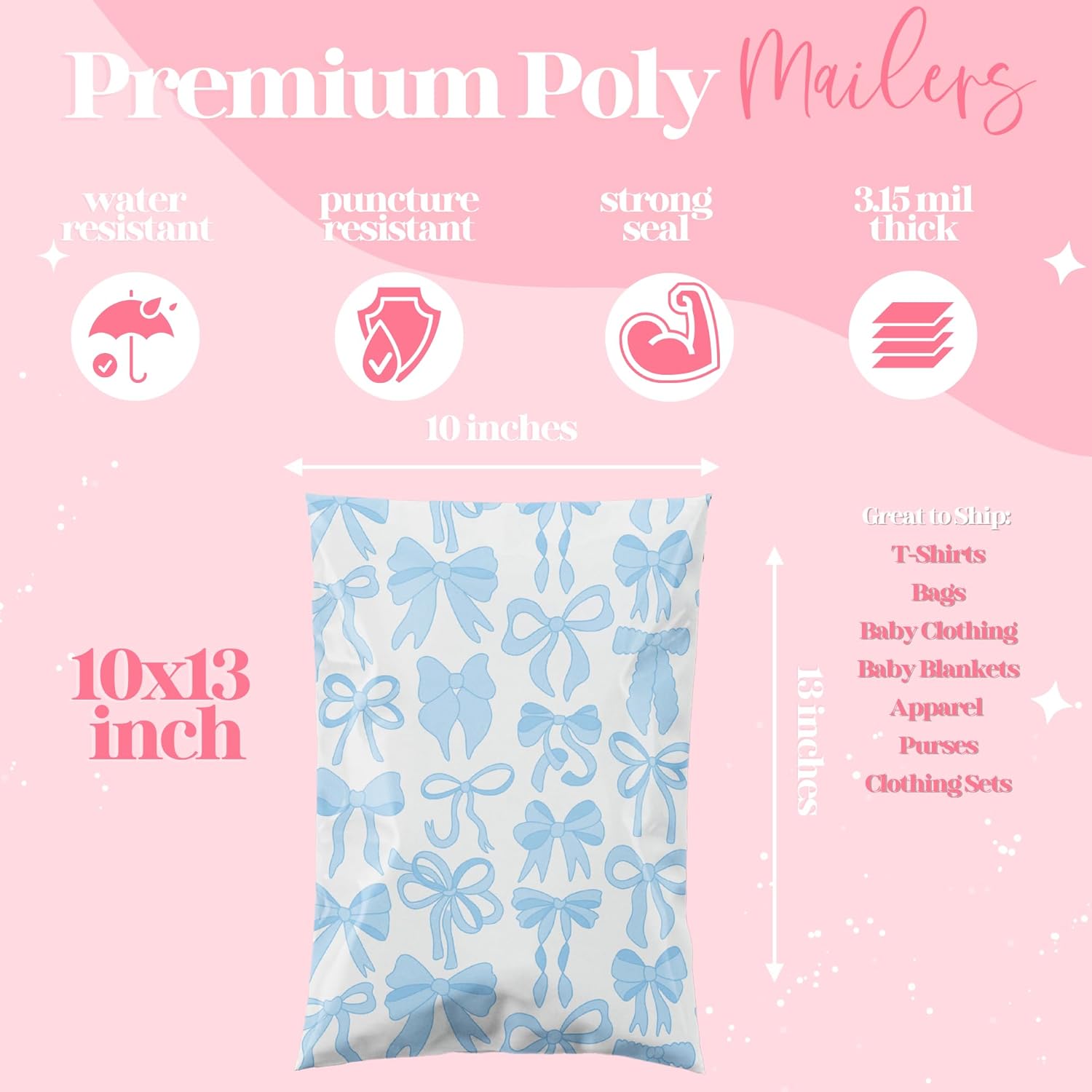 10x13 Designer Poly Mailer 100 Pack Heavy Duty Waterproof Self Seal Shipping Bags for Small Business Large Mailing Envelopes Bulk Tear Resistant Packaging Blue Bows