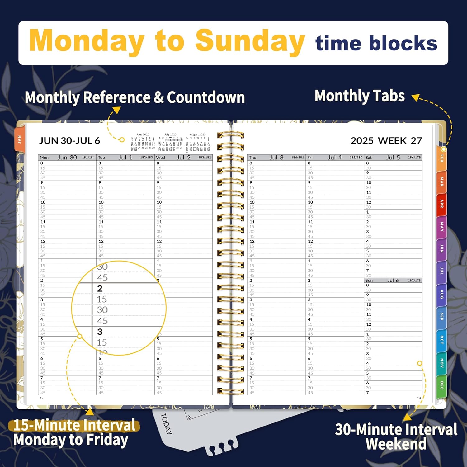 - Weekly View: 2-page weekly layout from Monday to Sunday, 15-minute time slots in increments from 8:00 a.m. to 7:45 p.m. on weekdays, and 8:00 a.m. to 7:30 p.m. on weekends, 3-month reference previews, allowing you to manage time and track appointments easily.
