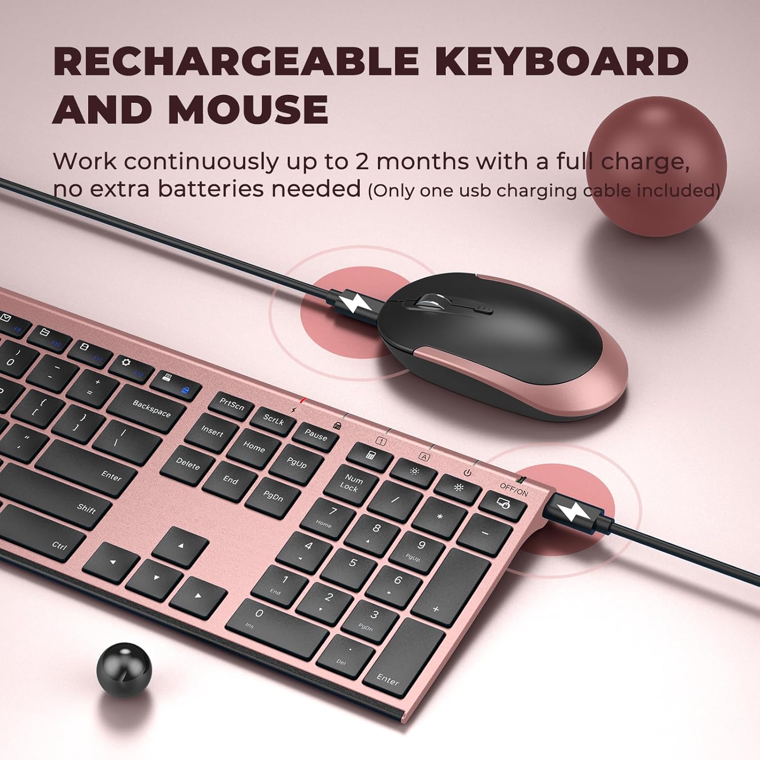 Wireless Keyboard and Mouse, Vssoplor 2.4GHz Rechargeable Compact Quiet Full-Size Keyboard and Mouse Combo with Nano USB Receiver for Windows, Laptop, PC, Notebook-Black and Rose Gold