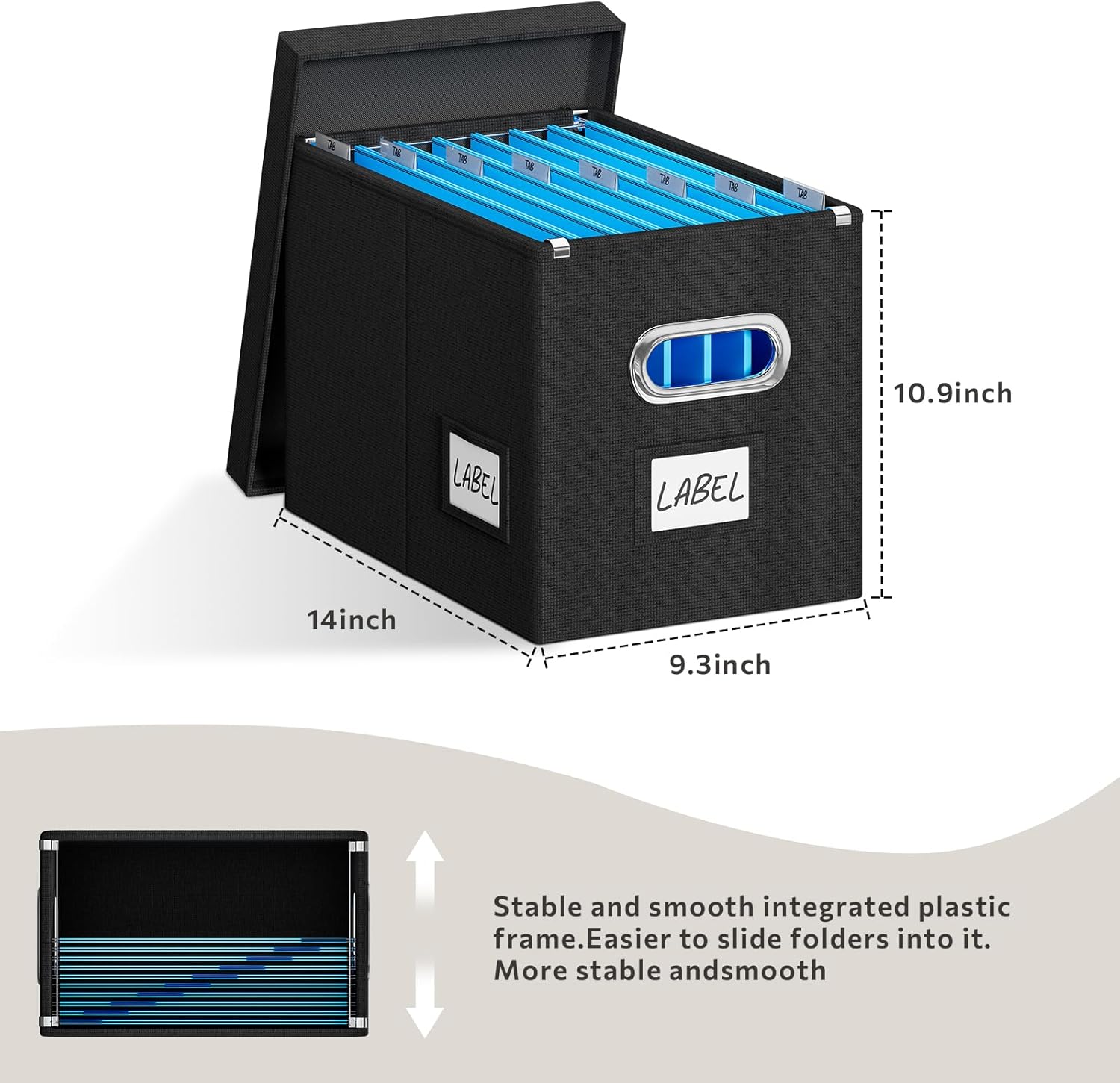File Organizer Box with Lid - Set of 2 Portable Hanging File Box, Collapsible Linen Decorative Filing Storage Boxes for Office & Home File Cabinet (Black 14 x 9.3 x 10.9 inch)