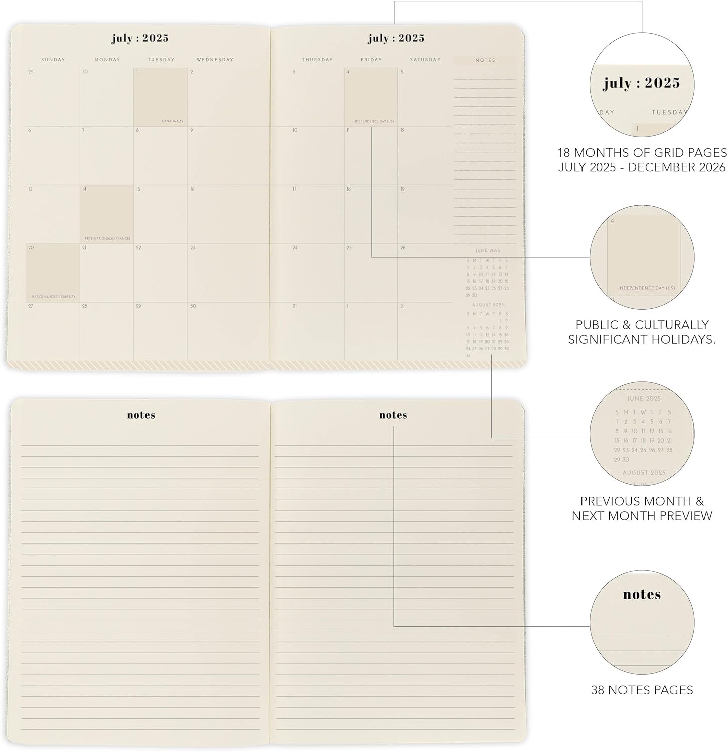 - 18-MONTH CALENDAR: Covers July 2025 through December 2026, featuring monthly views that show past and future month references for easy planning; includes public and culturally significant holidays to keep you informed